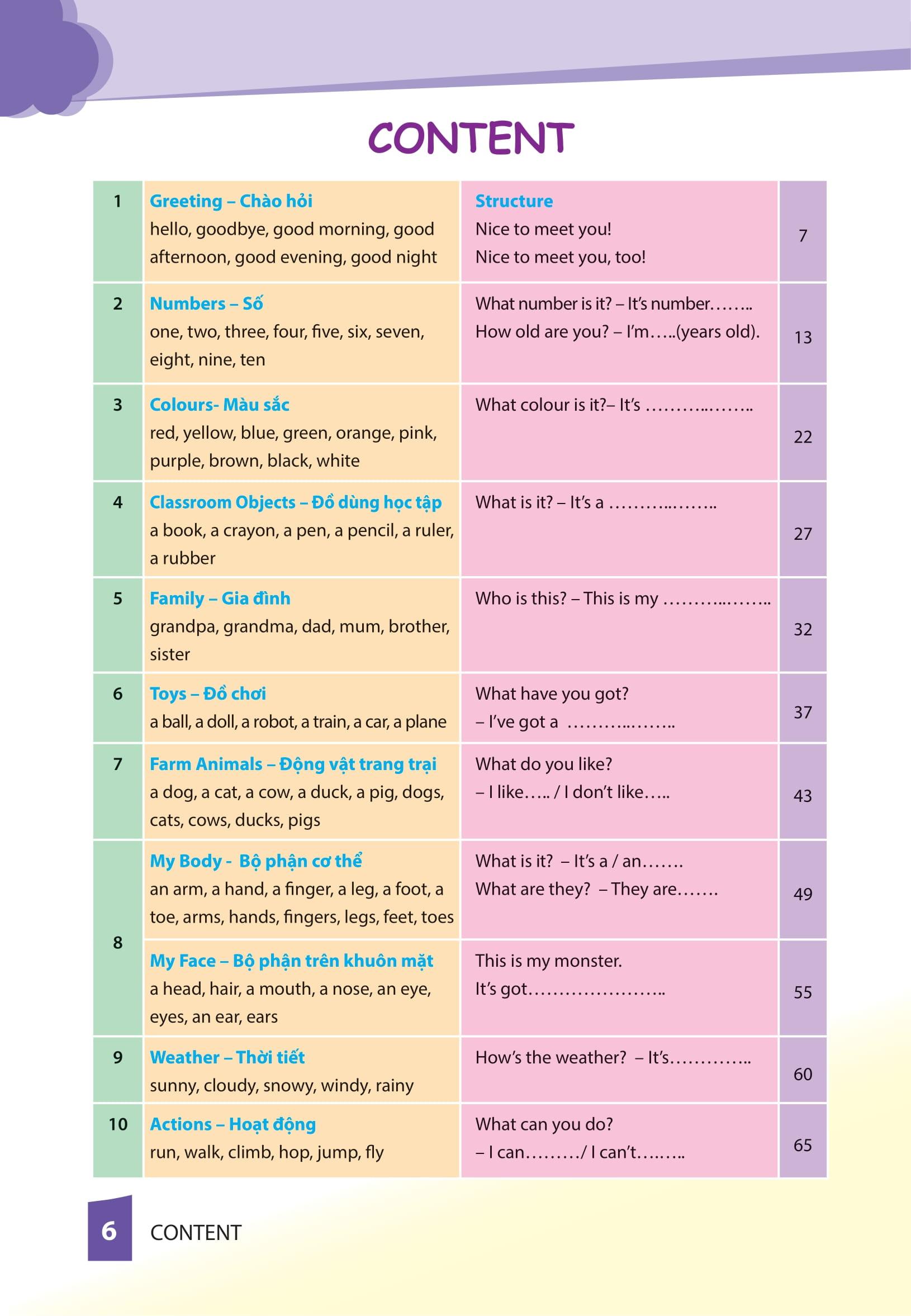 Nội dung chương trình bao gồm các chủ đề Chào hỏi – Số đếm – Màu sắc – Đồ dùng học tập – Gia đình – Đồ chơi – Động vật trang trại – Bộ phận cơ thể – Thời tiết – Hoạt động…