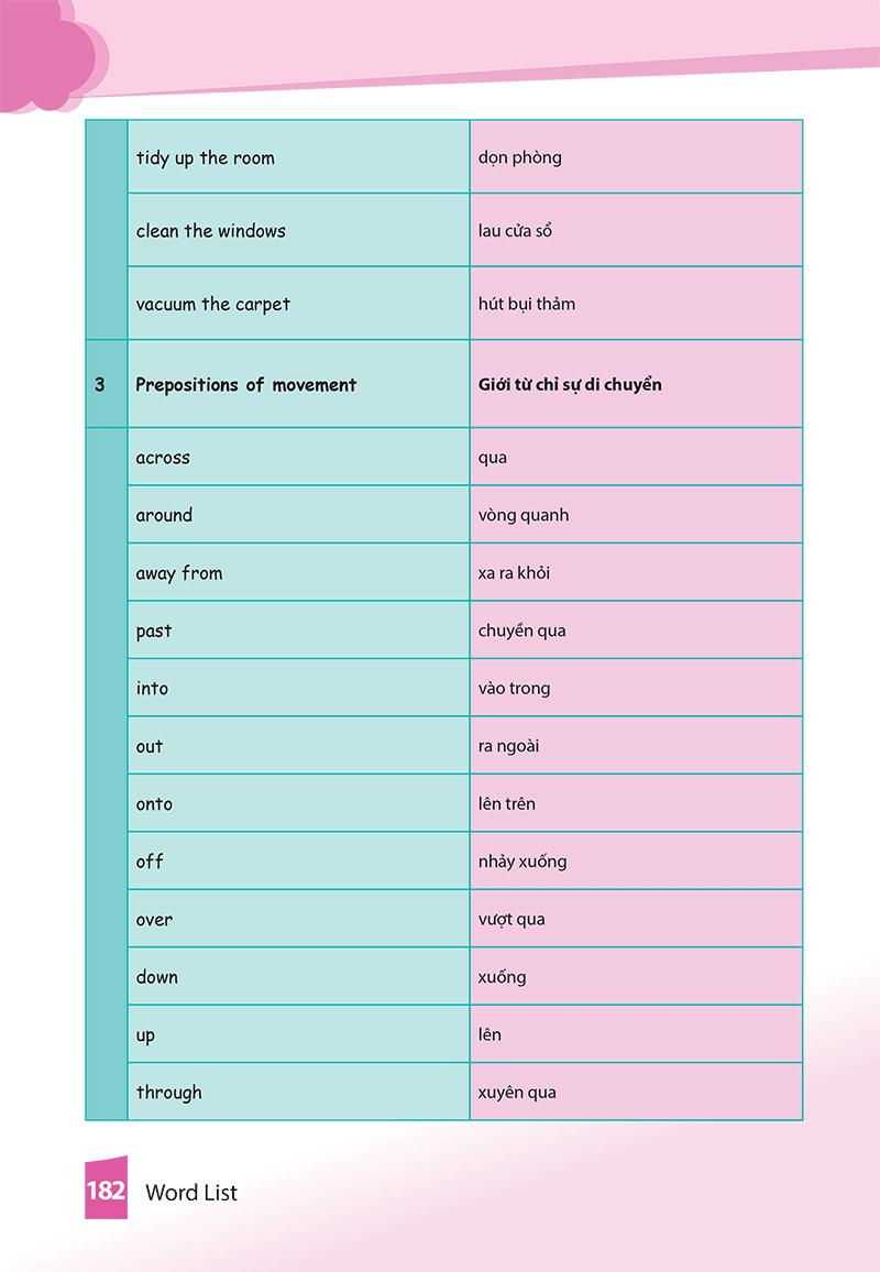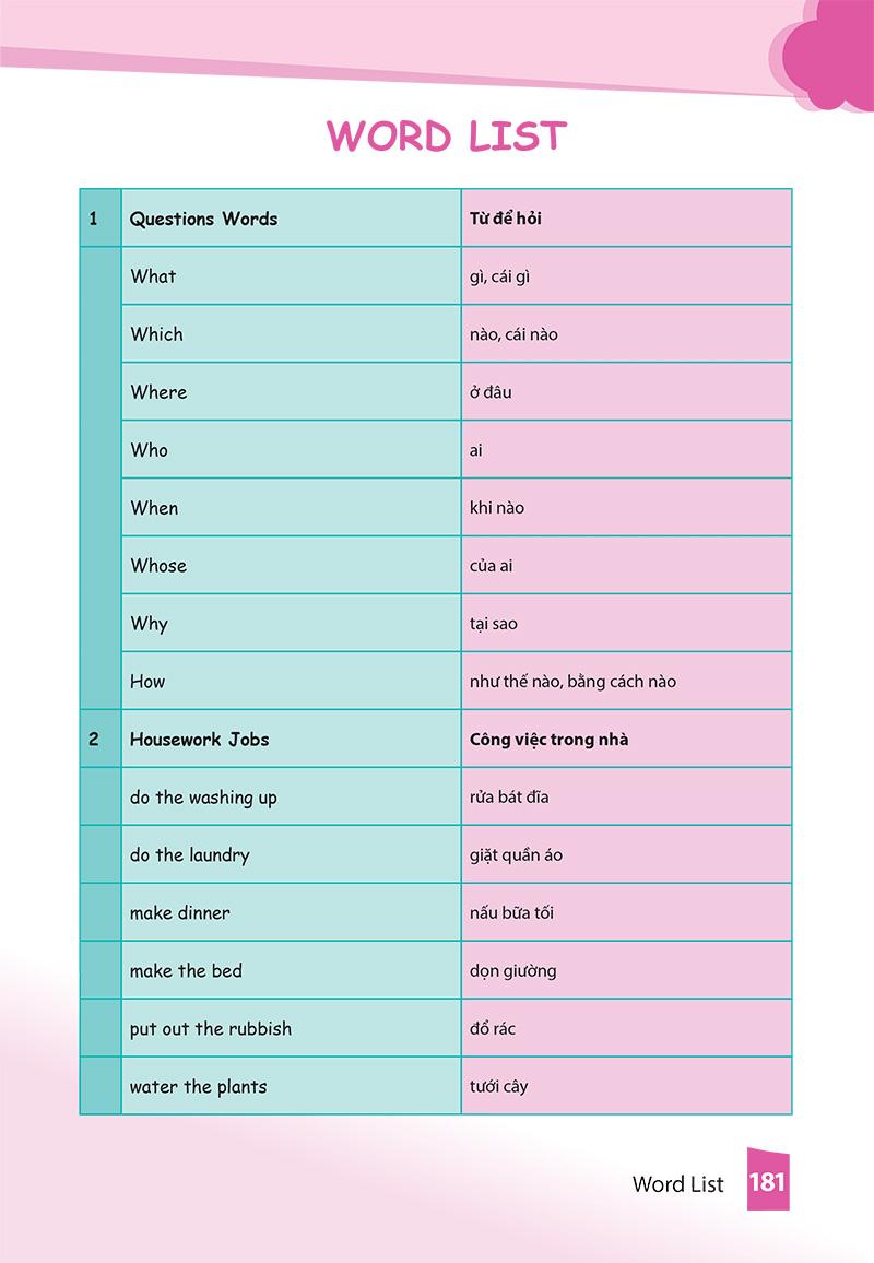 Nội dung chương trình bao gồm các chủ đề Từ để hỏi – Việc nhà – Giới từ chỉ sự di chuyển/thời gian – Đại từ nhân xưng chủ ngữ và đại từ nhân xưng tân ngữ; Tính từ sở hữu và đại từ sở hữu – Tính từ trái nghĩa – Thám hiểu rừng xanh – Hoạt động trong thời gian rảnh rỗi – Dự báo thời tiết – Thì Hiện tại hoàn thành