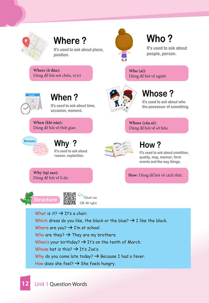 4. Nắm được những cấu trúc đặt câu hỏi với từ để hỏi căn bản 5W-1H; những kiến thức căn bản về thì Quá khứ tiếp diễn; Hỏi và trả lời câu hỏi với giới từ; thay thế đại từ nhân xưng trong câu; so sánh hơn, so sánh nhất; nắm được những kiến thức về thì Tương lai gần, thì Tương lai đơn, thì Hiện tại hoàn thành…
