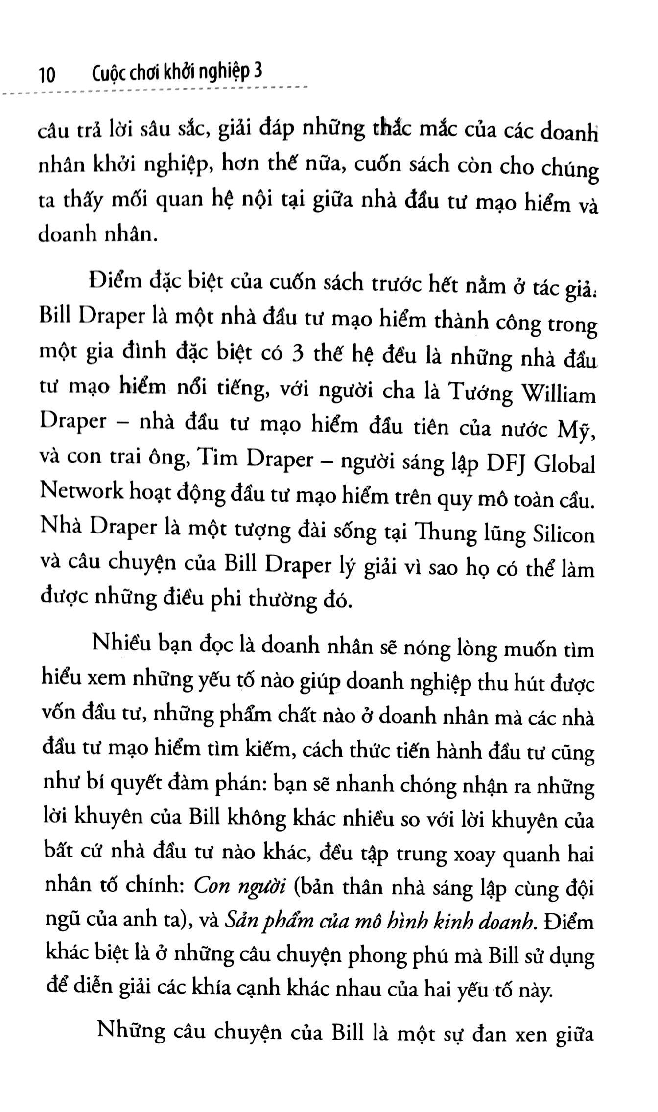 "Doanh nhân và nhà đầu tư - sự kết đôi hoàn hảo của những con người có khả năng làm thay đổi thế giới là điều Bill Draper muốn chia sẻ với độc giả bằng chính câu chuyện cuộc đời mình. Bạn đọc là doanh nhân đang muốn tìm và muốn biến sự kết đôi này trở nên hoàn hảo, thì cuốn sách này là gợi ý tuyệt vời nhất cho bạn."
