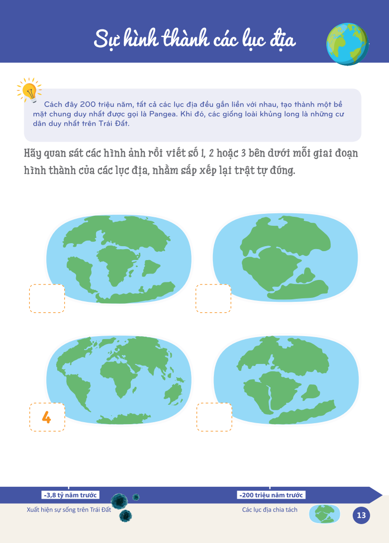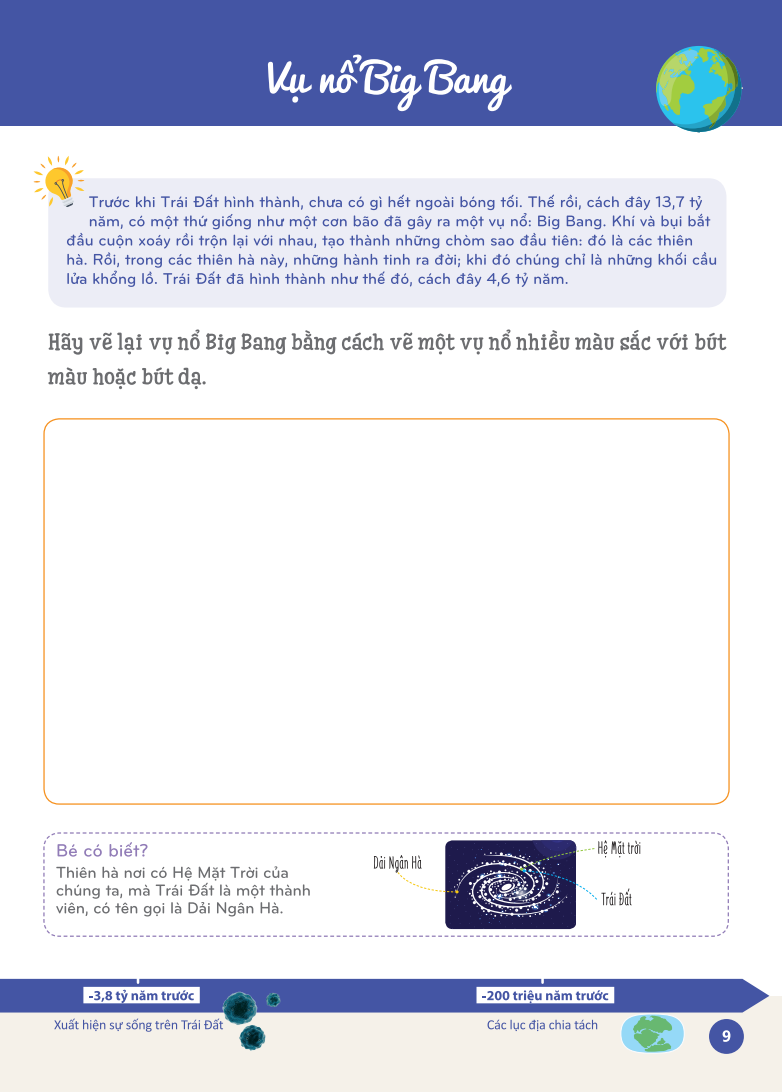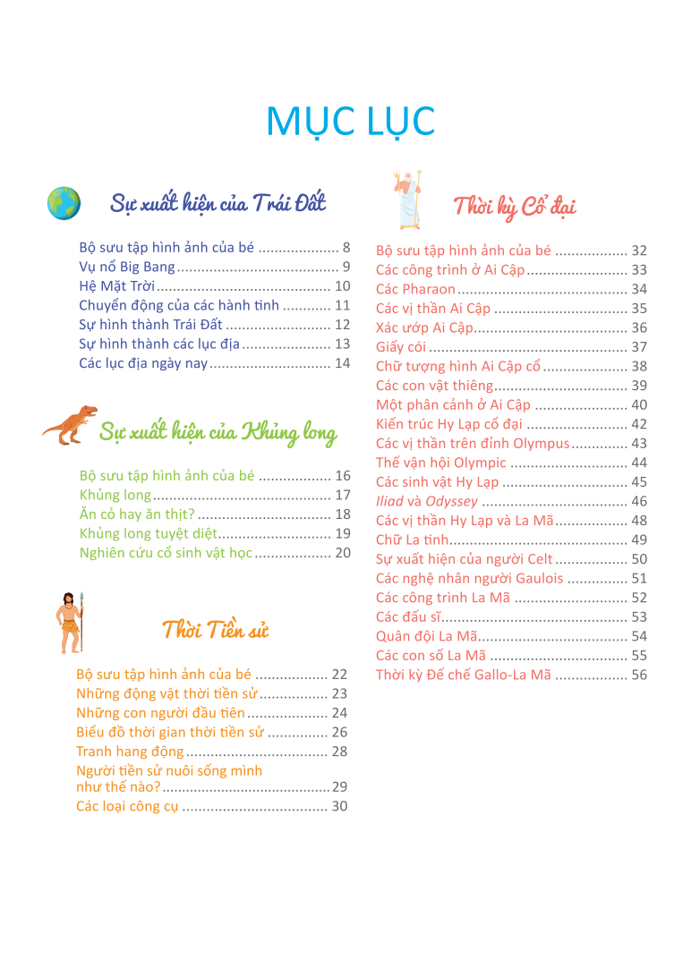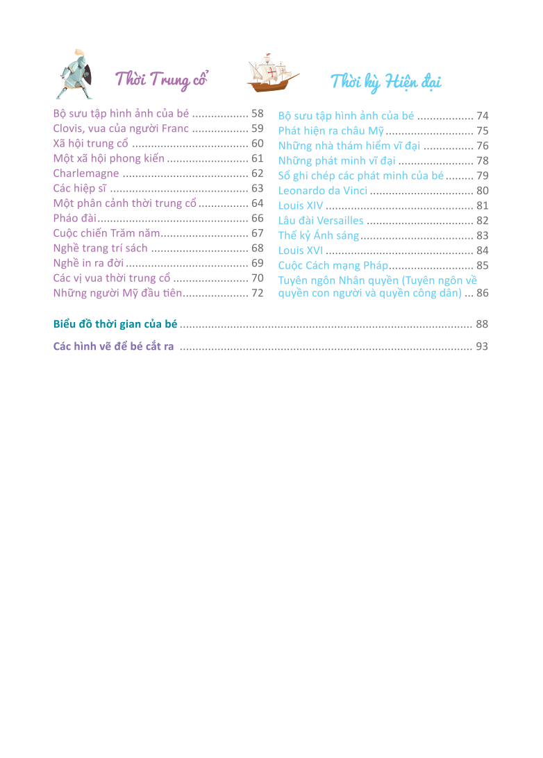 + Mỗi giai đoạn lịch sử (hình thành Trái Đất, thời Tiền sử, thời cổ đại, thời Trung cổ, thời Hiện đạ) sẽ được giới thiệu thông qua hoạt động khám phá, tiếp đến các trò chơi nhằm giúp trẻ hiểu biết thêm về giai đoạn đó cùng những sự kiện then chốt (dựng lại phân cảnh, sắp xếp hình ảnh, vẽ lại những chuyến đi trên bản đồ, ). Các chi tiết có thể cắt ra ở phẩn cuối sách sẽ giúp trẻ ghi nhớ dễ dàng hơn.