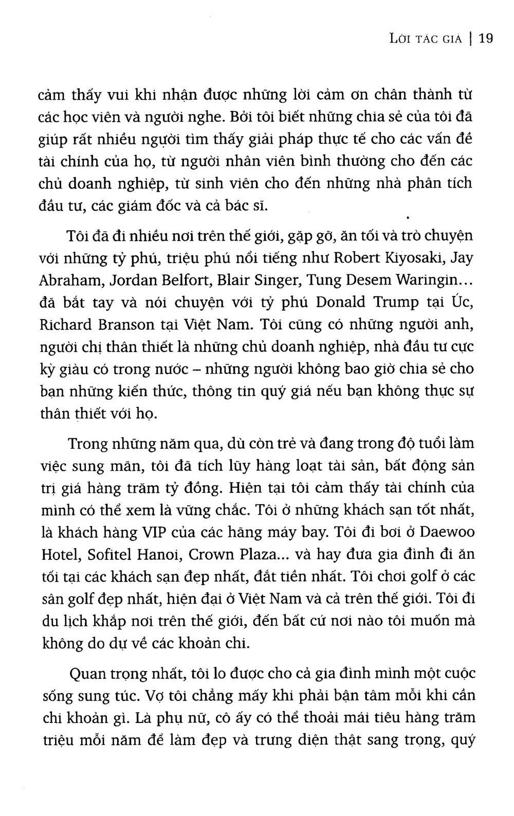Cuốn sách được trình bày trình tự từng bước, với 6 bí quyết, 9 nguyên tắc, 7 công thức làm giàu và hàng chục bài tập hành độ, mong rằng bạn đọc sẽ tìm thấy mọi câu trả lời đưa bạn đi đến tự do tài chính và sự giàu có. Hãy đọc thật kỹ, để hiểu thông điệp từ cuốn sách, vì những gì chia sẻ trong cuốn sách này sẽ giúp bạn giàu có. Những giải pháp đưa ra sẽ phù hợp với tất cả mọi người, từ những người bình thường nhất, những người không thông minh. không xuất xuất sắc đến tất cả đều có thể áp dụng được.