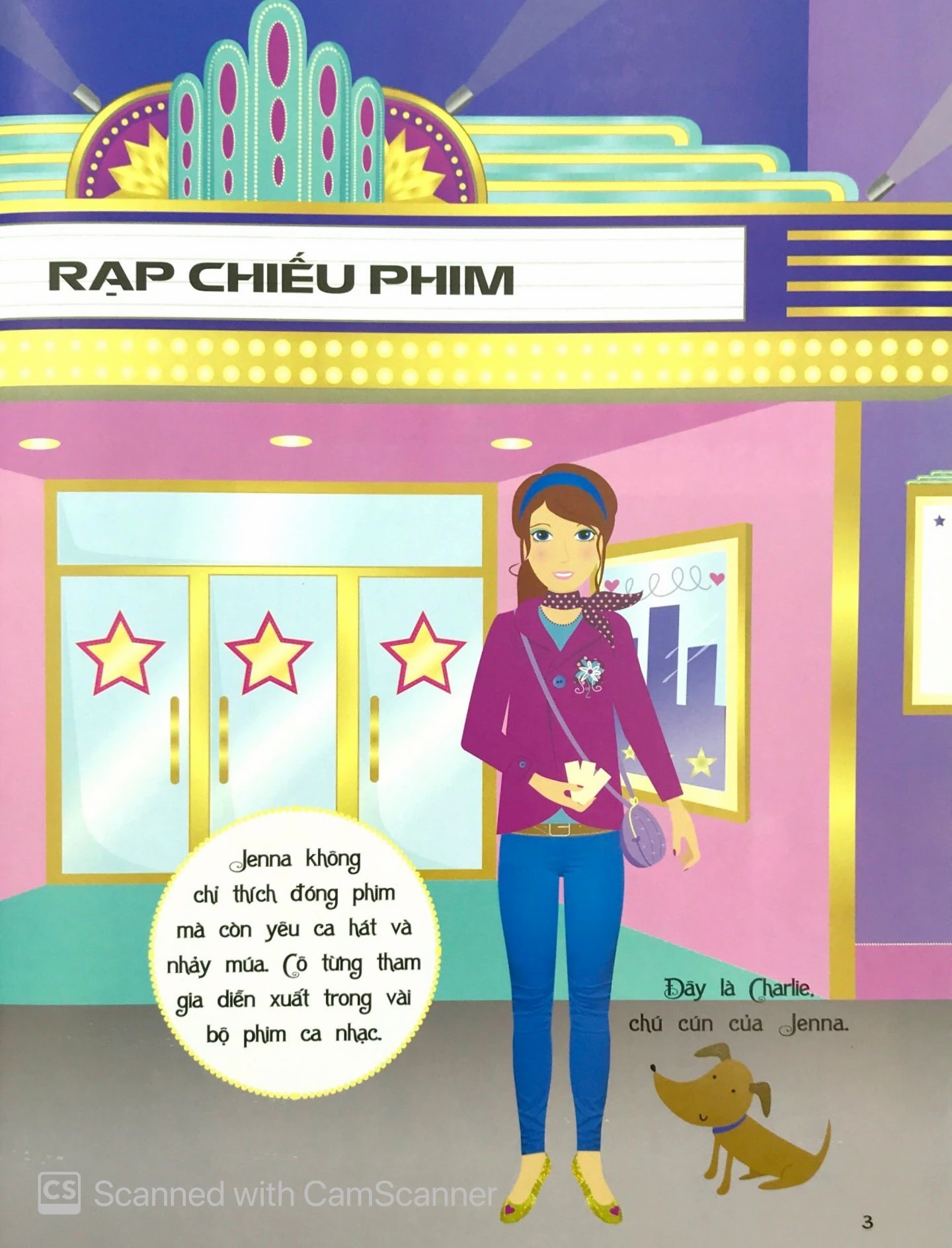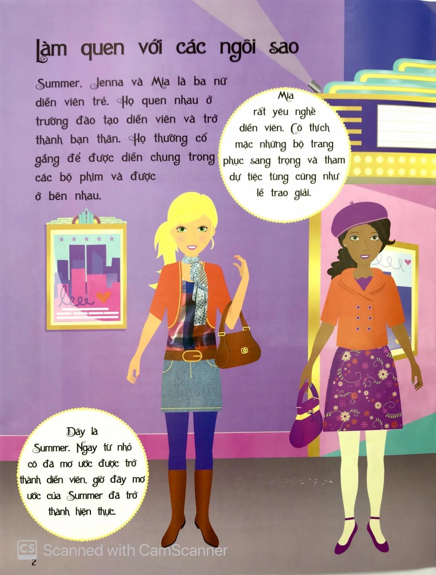 - Mia, Summer và Jenna là ba nữ diễn viên trẻ rất thích diễn xuất trước máy quay và hóa thân thành các nhân vật trong nhiều bộ phim. Em hãy dùng những miếng dán trong sách để giúp họ chuẩn bị trang phục cho những dịp như chụp hình, thử vai, đóng phim hành động, hay tham dự lễ trao giải và nhiều hoạt động thú vị khác nhé!