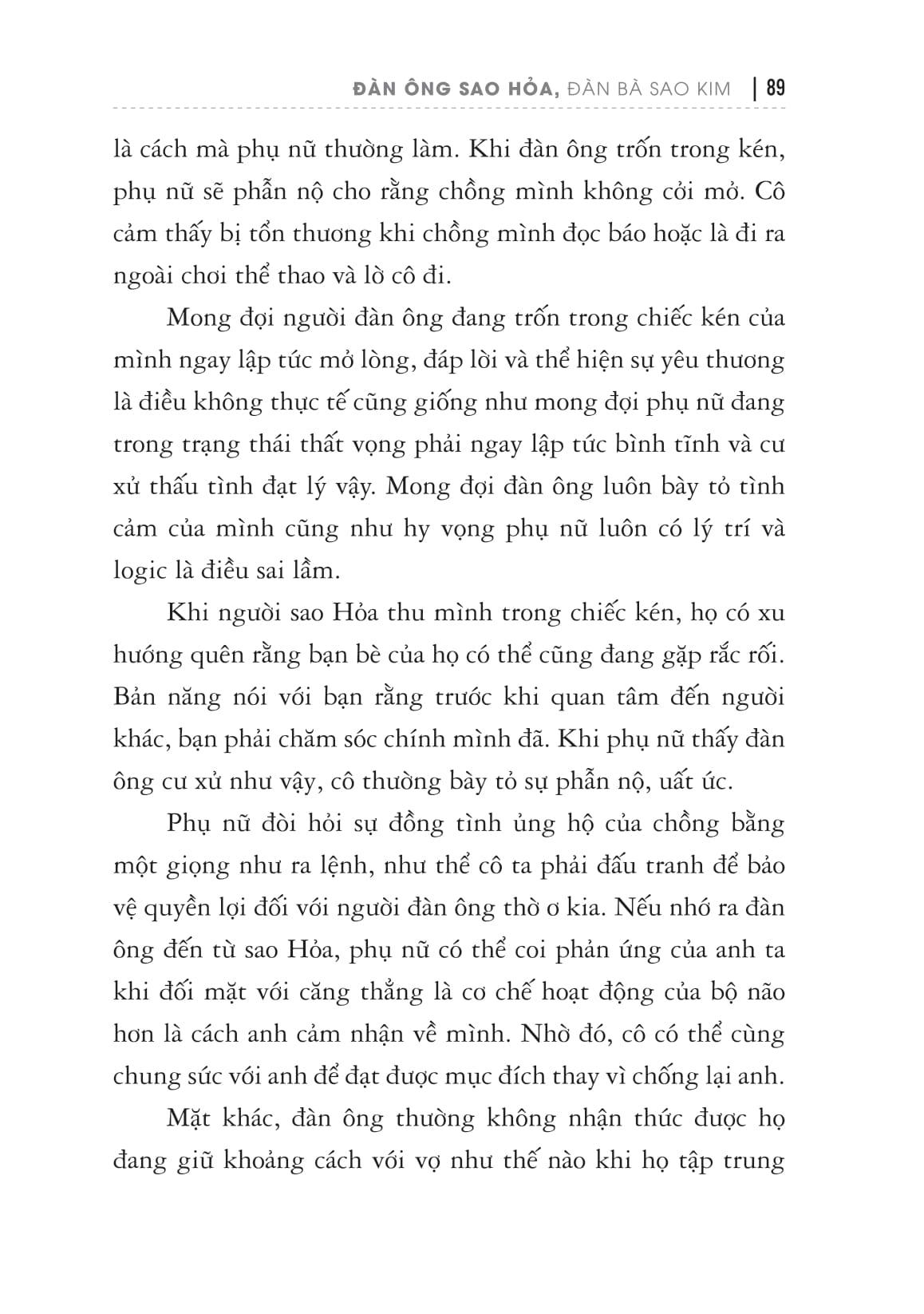 Có nhiều người áp dụng sai những khái niệm trong cuốn sách này. Họ dùng ví dụ và giải thích này của tôi để bào chữa cho việc không chịu thay đổi những khía cạnh quan trọng giúp mối quan hệ trở nên tốt đẹp hơn. Chẳng hạn, tôi chỉ ra rằng đàn ông cần chui vào chiếc kén của mình thường