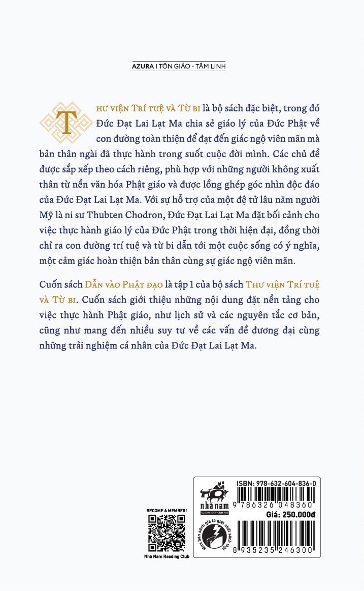 THƯ VIỆN TRÍ TUỆ VÀ TỪ BI là bộ sách đặc biệt, trong đó Đức Đạt Lai Lạt Ma chia sẻ giáo lý của Đức Phật về con đường toàn thiện để đạt đến giác ngộ viên mãn mà bản thân ngài đã thực hành trong suốt cuộc đời mình. Các chủ đề được sắp xếp theo cách riêng, phù hợp với những người không xuất thân từ nền văn hóa Phật giáo và được lồng ghép góc nhìn độc đáo của Đức Đạt Lai Lạt Ma. Với sự hỗ trợ của một đệ tử lâu năm người Mỹ là ni sư Thubten Chodron, Đức Đạt Lai Lạt Ma đặt bối cảnh cho việc thực hành giáo lý của Đức Phật trong thời hiện đại, đồng thời chỉ ra con đường trí tuệ và từ bi dẫn tới một cuộc sống có ý nghĩa, một cảm giác hạnh phúc bền vững cùng giác ngộ viên mãn.Giá sản phẩm trên Tiki đã bao gồm thuế theo luật hiện hành. Bên cạnh đó, tuỳ vào loại sản phẩm, hình thức và địa chỉ giao hàng mà có thể phát sinh thêm chi phí khác như phí vận chuyển, phụ phí hàng cồng kềnh, thuế nhập khẩu (đối với đơn hàng giao từ nước ngoài có giá trị trên 1 triệu đồng).....