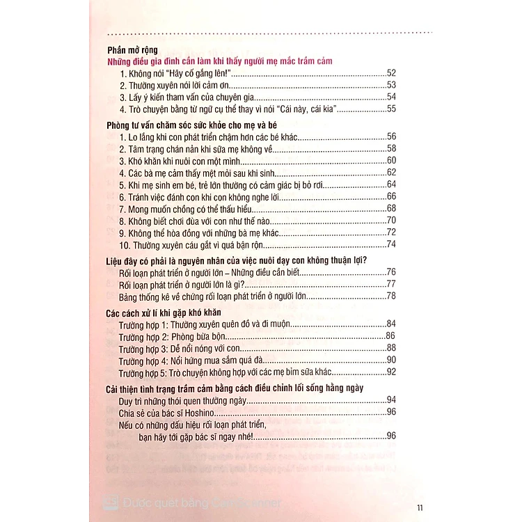 - Cụ thể, Chương 2 có chủ đề Vượt qua trầm cảm bằng hành động, do bác sĩ Ono biên soạn. Chương 3: Vượt qua trầm cảm bằng giấc ngủ, do chuyên gia tư vấn về giấc ngủ Aiba Aya biên soạn. Chương 4: Chế độ ăn giúp cải thiện chứng trầm cảm, do Hosokawa Momo, chuyên gia tư vấn về sức khỏe mẹ và bé biên soạn.