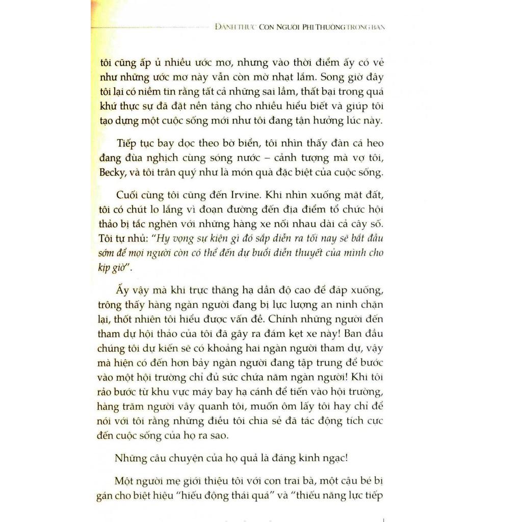 Đem tất cả tâm huyết và khát khao giúp người khác thay đổi, Anthony Robbins chia sẻ tất cả những gì là bí quyết thành công của mình trong cuốn sách “Đánh thức con người phi thường trong bạn”. Ông nói: “Tôi thực sự tin tưởng trong mỗi chúng ta có một con người phi thường đang say ngủ. Tôi viết quyển sách này chỉ với một nguyện vọng, mong sao nó sẽ trở thành một tiếng gọi lay tỉnh, thách thức những ai vẫn còn nhiệt tâm với cuộc sống, giúp họ khai thác nguồn sức mạnh mà tạo hóa đã ban tặng”.