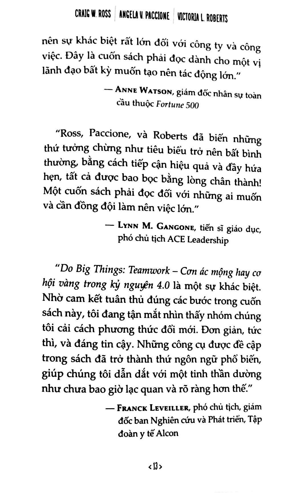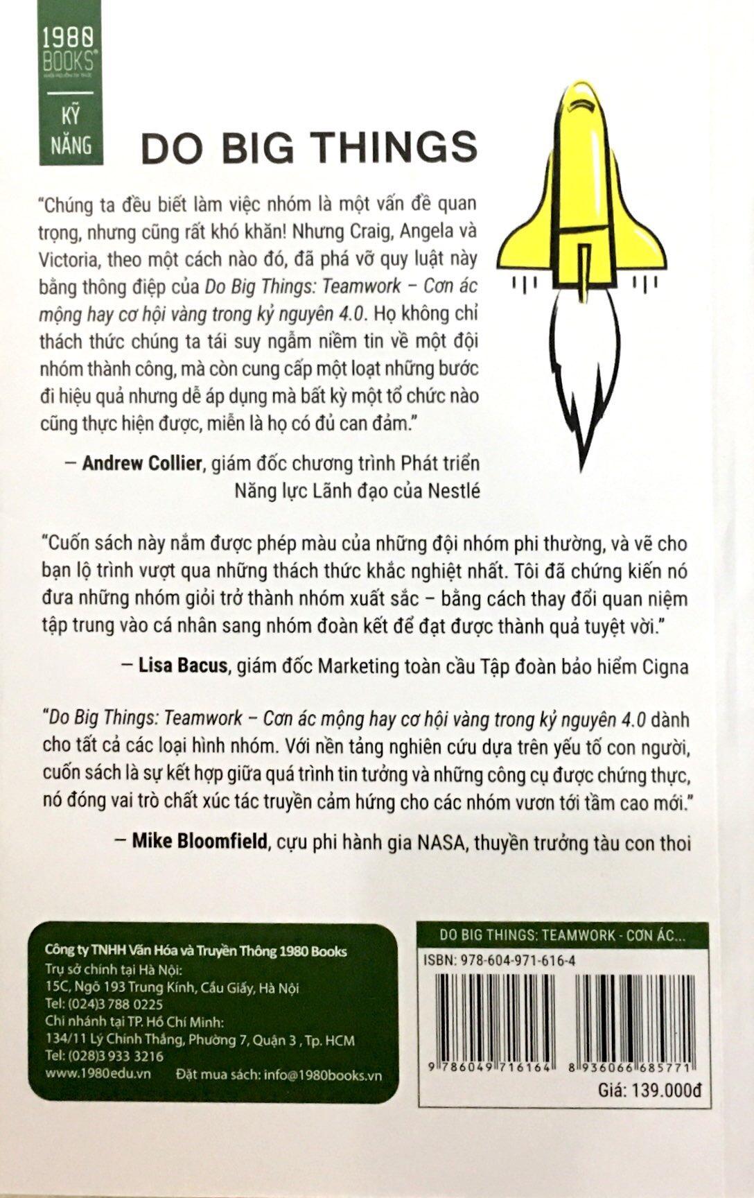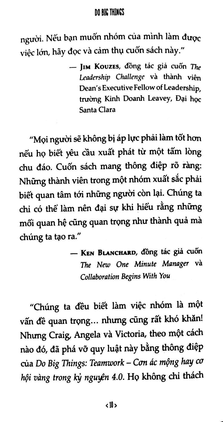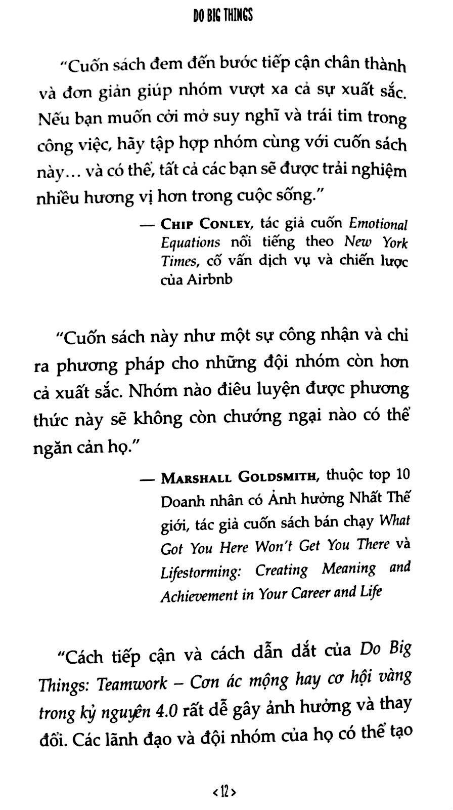 Dựa trên 25 năm nghiên cứu của các tác giả trên rất nhiều ngành nghề, tại nhiều quốc gia lớn nhỏ khác nhau, cuốn sách "Do Big Things" đã giải mã một công thức bí ẩn: một loại hình tư duy mà đội nhóm có thể sử dụng trong mọi lĩnh vực để vượt qua thách thức, đem lại kết quả cao.