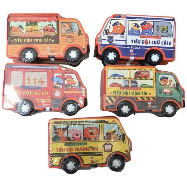 Đội xe thông minh gồm có 5 tiểu đội: Tiểu đội chữ cái; Tiểu đội vận tải; Tiểu đội trái cây; Tiểu đội chữ số và Tiểu đội muông thú. Bộ sách in trên chất liệu xốp, có hình ảnh minh họa (hình vẽ). Mỗi trang có phần Từ tiếng Việt – Từ tiếng Anh – Phiên âm tiếng Anh và một đoạn thơ về sự vật/ con vật/ đồ vật trong tranh.