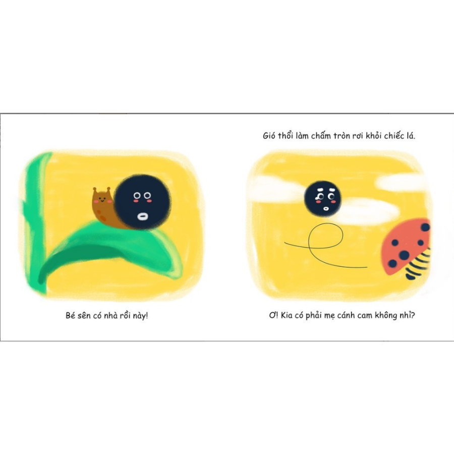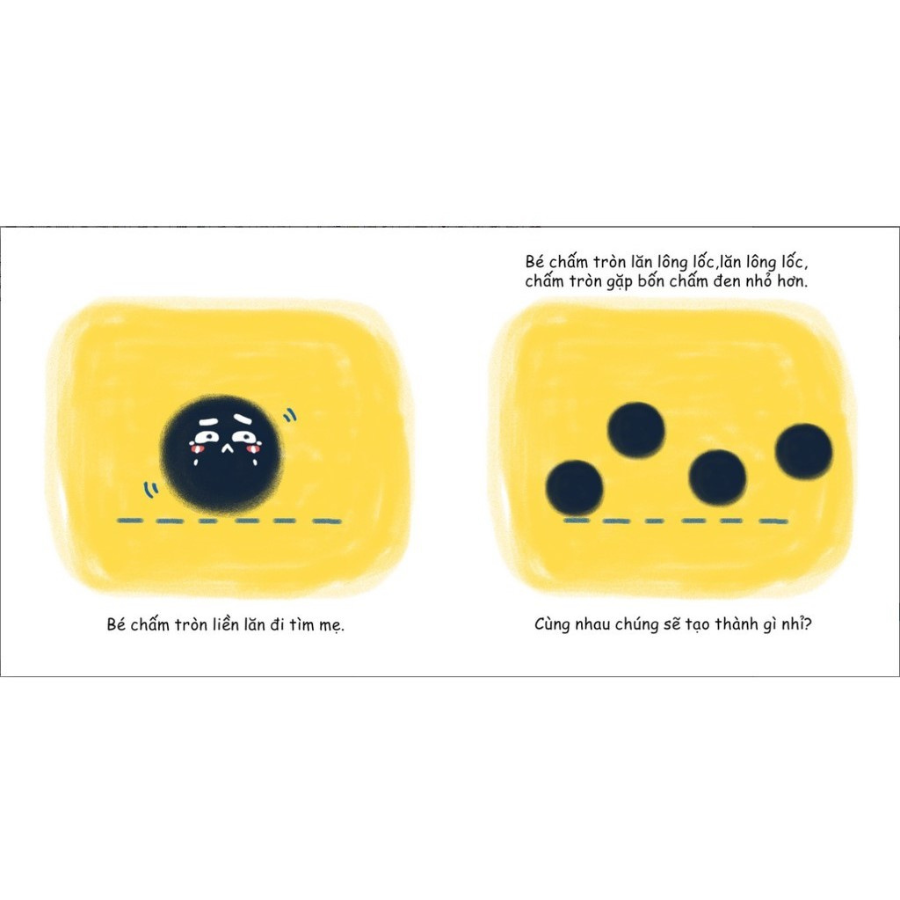 Ehon Hình Khối - Chấm Tròn Ơi! Đi Đâu Thế là sách về chấm tròn rơi ra từ mẹ cánh cam và hành trình tìm lại mẹ hấp dẫn, bé gặp rất nhiều hình khối, bé kết hợp với các hình khối tạo ra các loại đồ vật đáng yêu với màu sắc khác nhau (dấu chân bác sư tử, đèn giao thông, khinh khí cầu, kẹo mút, quả vải, ốc sên). Cuối cùng bé lăn vào hố, và trở lại màu đen, làn gió mang bé đi tìm lại.