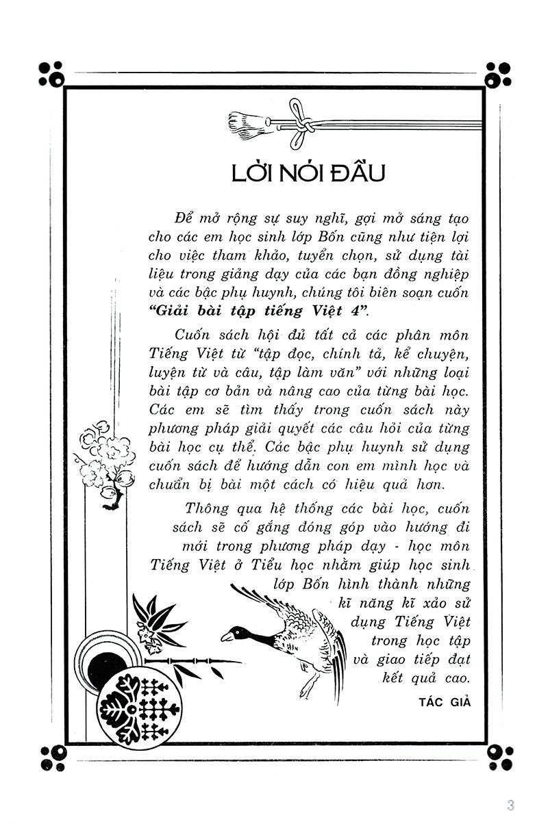 Để mở rộng sự suy nghĩ, gợi mở sáng tạo cho các em học sinh lớp 4 cũng như tiện lợi cho việc tham khảo, tuyển chọn, sử dụng tài liệu trong giảng dạy của các bạn đồng nghiệp và các bậc phụ huynh, chúng tôi biên soạn cuốn "Giải Bài Tập Tiếng Việt Lớp 4".