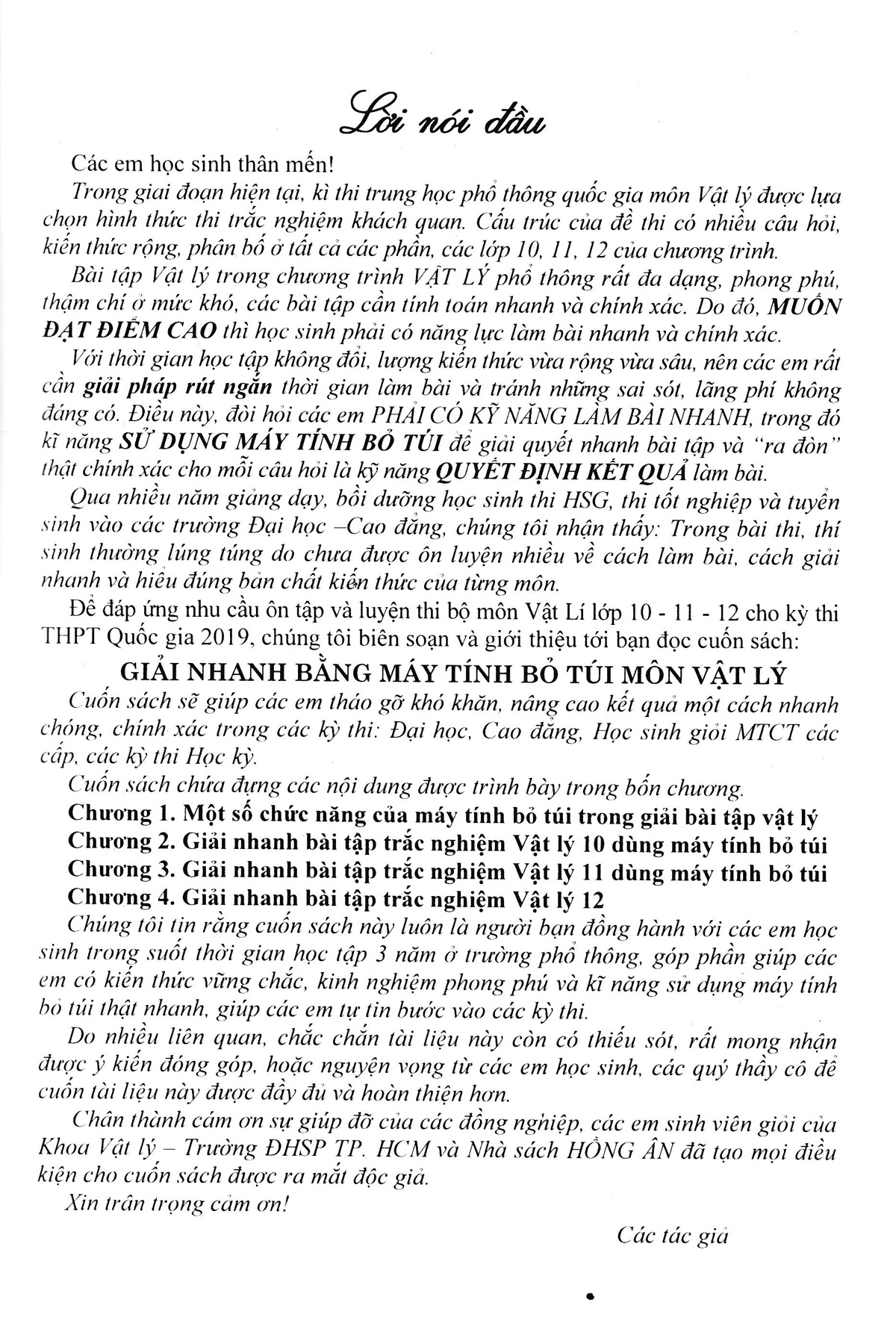 Bài tập Vật Lí trong chương trình Vật Lí phổ thông rất đa dạng, phong phú, thậm chí ở mức khó, các bài tập cần tính toán nhanh và chính xác. Do đó, muốn đạt điểm cao thì học sinh phải có năng lực làm bài nhanh và chính xác.