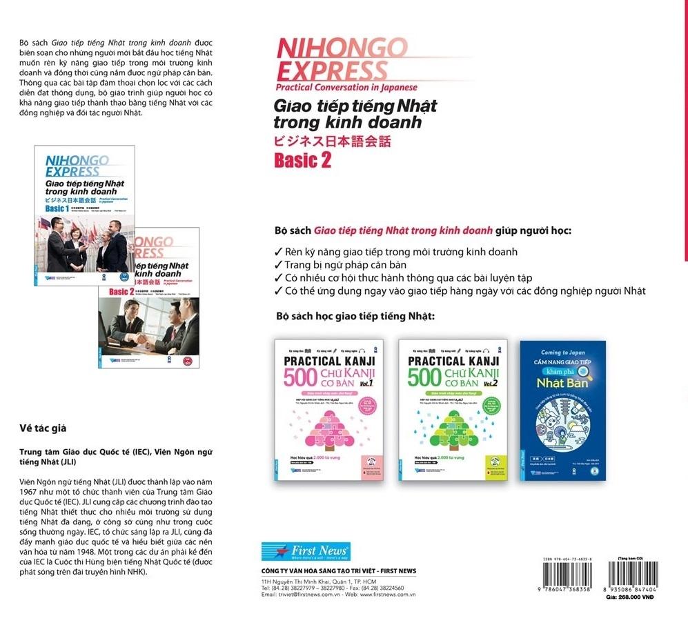 Sách Giao tiếp tiếng Nhật trong kinh doanh được trình bày song ngữ Nhật – Việt và có phiên âm chữ Romaji. Sách có danh mục từ vựng giúp việc học có hệ thống và đính kèm đĩa CD-ROM chứa các Đoạn hội thoại mẫu, Luyện tập, Điểm ngữ pháp và Bài kiểm tra được đọc bởi người bản xứ giúp người học có thể tự học ngữ pháp tại nhà, luyện nghe hiểu và phát âm chuẩn như người Nhật. CD-ROM chứa tương đương bảy đĩa CD.