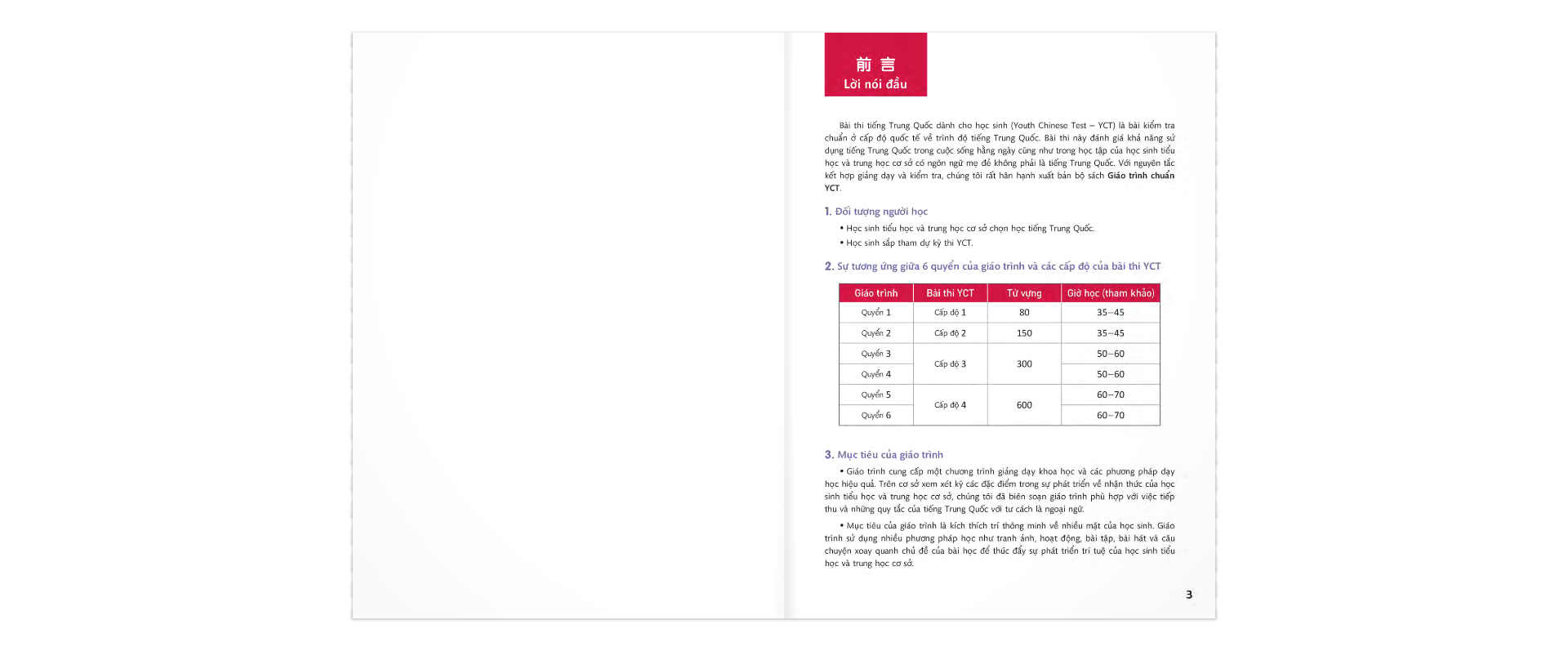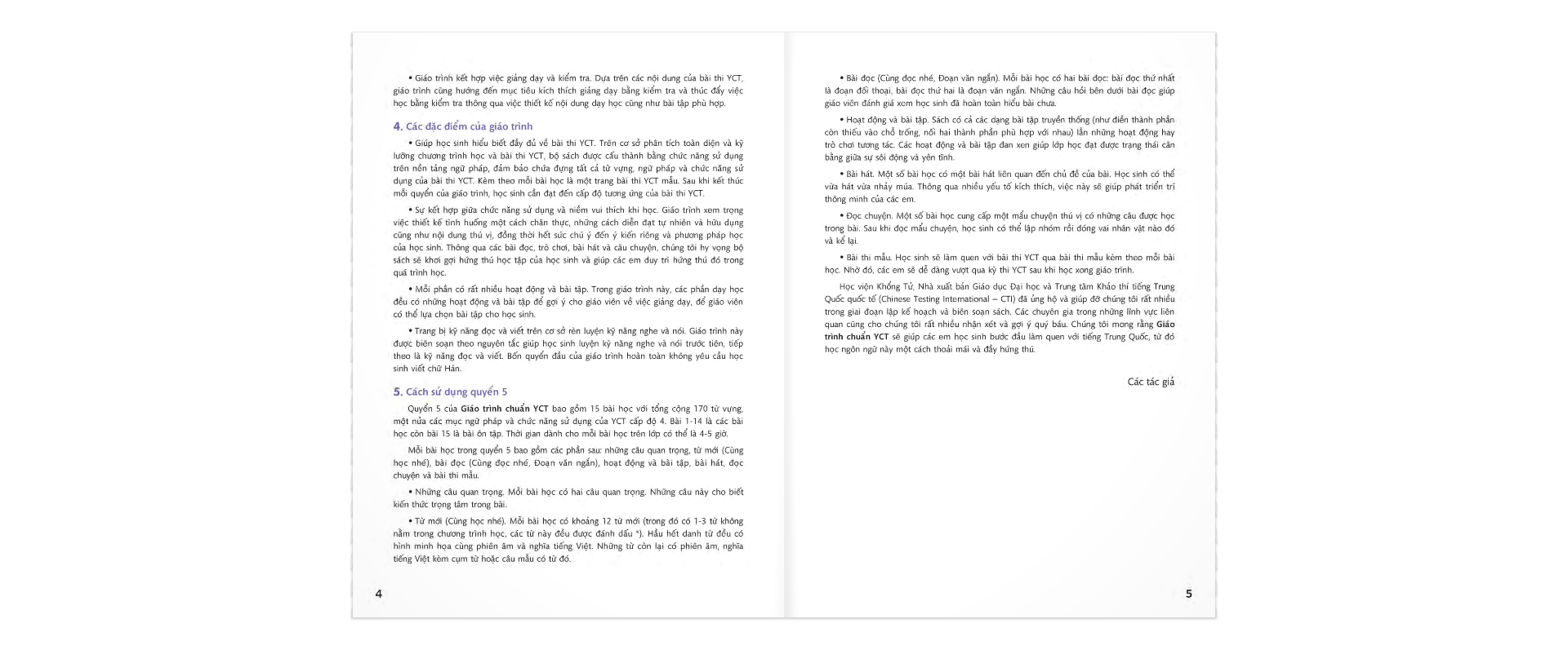 Bộ sách Giáo trình chuẩn YCT được biên soạn theo hướng bám sát các bài thi YCT đồng thời dựa trên nguyên tắc kết hợp giảng dạy và kiểm tra.