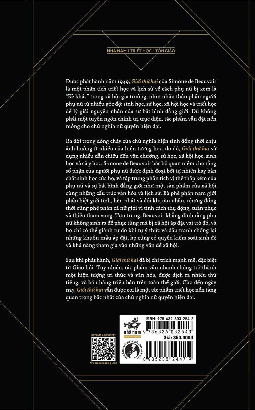Được phát hành năm 1949, Giới thứ hai của Simone de Beauvoir là một phân tích triết học và lịch sử về cách phụ nữ bị xem là “Kẻ khác” trong xã hội gia trưởng, nhìn nhận thân phận người phụ nữ từ nhiều góc độ: sinh học, sử học, xã hội học và triết học để lý giải nguyên nhân của sự bất bình đẳng giới. Dù không phải một tuyên ngôn chính trị trực diện, tác phẩm vẫn đặt nền móng cho chủ nghĩa nữ quyền hiện đại.Ra đời trong dòng chảy của chủ nghĩa hiện sinh đồng thời chịu ảnh hưởng ít nhiều của hiện tượng học, do đó, Giới thứ hai sử dụng nhiều dẫn chiếu đến văn chương, sử học, xã hội học, sinh học và cả y học. Simone de Beauvoir bác bỏ quan niệm cho rằng số phận của người phụ nữ được định đoạt bởi tự nhiên hay bản chất sinh học của họ, và tập trung phân tích vị thế thấp kém của phụ nữ và sự bất bình đẳng giới như một sản phẩm của xã hội cùng những cấu trúc văn hóa và lịch sử. Bà phê phán nam giới phân biệt giới tính, hèn nhát và đôi khi tàn nhẫn, nhưng đồng thời cũng phê phán cả nữ giới vì tính cách thụ động, tuân phục và thiếu tham vọng. Tựu trung, Beauvoir khẳng định rằng phụ nữ không sinh ra để phục tùng mà bị xã hội áp đặt vai trò đó, và họ chỉ có thể giành tự do khi tự ý thức và đấu tranh chống lại những khuôn mẫu áp đặt, họ cũng có quyền kiểm soát sinh đẻ và khả năng tham gia vào những vấn đề xã hội.