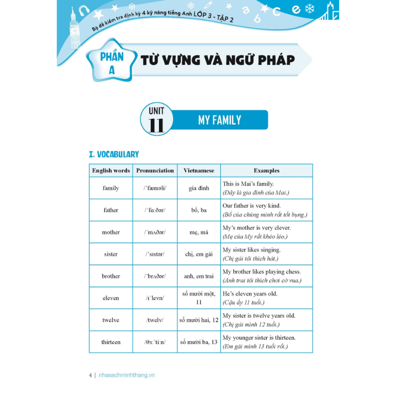 +Phần A: Từ vựng và Ngữ pháp (Unit 11 – Unit 20) Gồm từ và ngữ pháp chi tiết của từng bài học giúp các em củng cố, nắm vững vung được các nội dung đã học và sẽ kiểm tra.