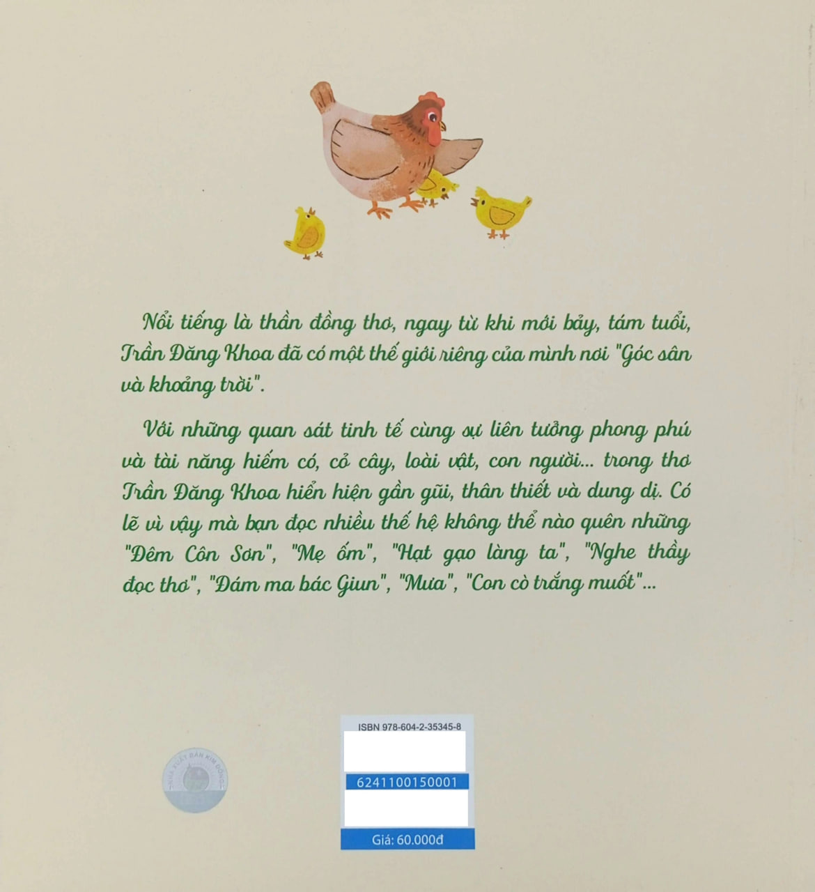 Nổi tiếng là thần đồng thơ, ngay từ khi mới bảy, tám tuổi, Trần Đăng Khoa đã có một thế giới riêng của mình nơi “Góc sân và khoảng trời”. Với những quan sát tinh tế cũng sự liên tưởng phong phú và tài năng hiếm có, cỏ cây, loài vật, con người… trong thơ Trần Đăng Khoa hiển hiện gần gũi, thân thiết và dung dị. Có lẽ vì vậy mà bạn đọc nhiều thế hệ không thể nào quên những “Đêm Côn Sơn”, “Mẹ ốm”, “Hạt gạo làng ta”, “Nghe thầy đọc thơ”, “Đám ma bác Giun”, “Mưa”, “Con cò trắng muốt”…