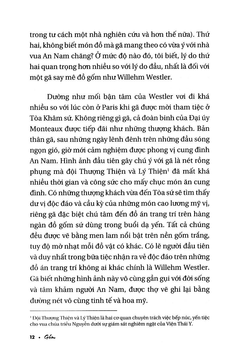 Như tác giả Nguyễn Hữu Nam chia sẻ, khi bắt tay viết Gốm anh không có nhiều vốn liếng kiến thức về nghề cổ truyền này. Đọc tư liệu thôi chưa đủ, anh tham gia những hội chợ đồ gốm, rong ruổi ở làng gốm Tân Vạn, vào từng hộ có lò gốm đang trên bờ lăn lốc, tàn lụi… Những người thợ gốm nhem nhuốc lam lũ với thù lao ít ỏi đang cố giữ cái nghề truyền thống mà cha ông trao truyền, những con người mang vẻ muôn năm cũ ấy, rách giấy vẫn cố giữ lấy nghề ấy được anh tái hiện trên nền cảnh của ngôi làng có “Om Phước Tích ngon cơm hoàng đế” bên dòng Ô Lâu hiền hòa xứ Huế thế kỷ XIX. Ở Gốm, có những trang viết dành cho nghề gốm cổ truyền tuyệt mỹ của dân tộc, và sự ngưỡng vọng dành cho đức vua Hàm Nghi.