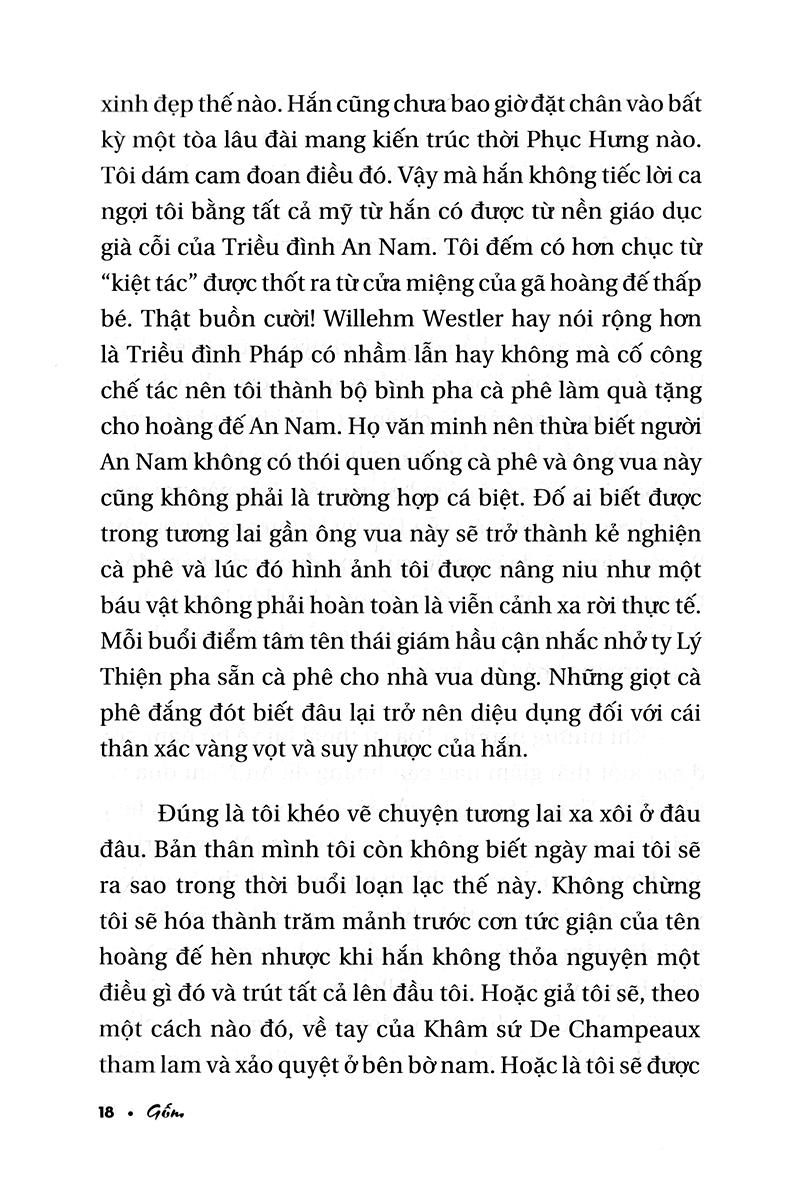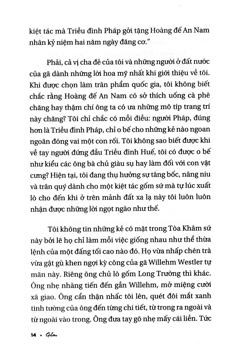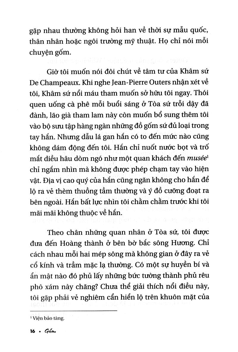 Tiểu thuyết Gốm lấy cảm hứng từ sự kiện lịch sử vị vua cách mạng Hàm Nghi bị phế truất khỏi ngai vàng, bí mật tham gia phong trào Cần Vương trước khi phải chịu cảnh lưu đày biệt xứ tận Phi châu. Song song trong đó là câu chuyện gặp gỡ tình cờ giữa chàng thợ gốm trẻ tuổi tài hoa đến từ làng Phước Tích và tay chủ lò gốm Long Trường đến từ Đại Pháp. Trong quá trình hoàn thiện bức tranh gốm vẽ chân dung đương kim hoàng đế, cả hai bất ngờ bước vào cuộc đối đầu tư tưởng căng thẳng, vào xung đột về quan điểm và xu hướng sáng tạo nghệ thuật, sự khám phá bản thể và đối phương.