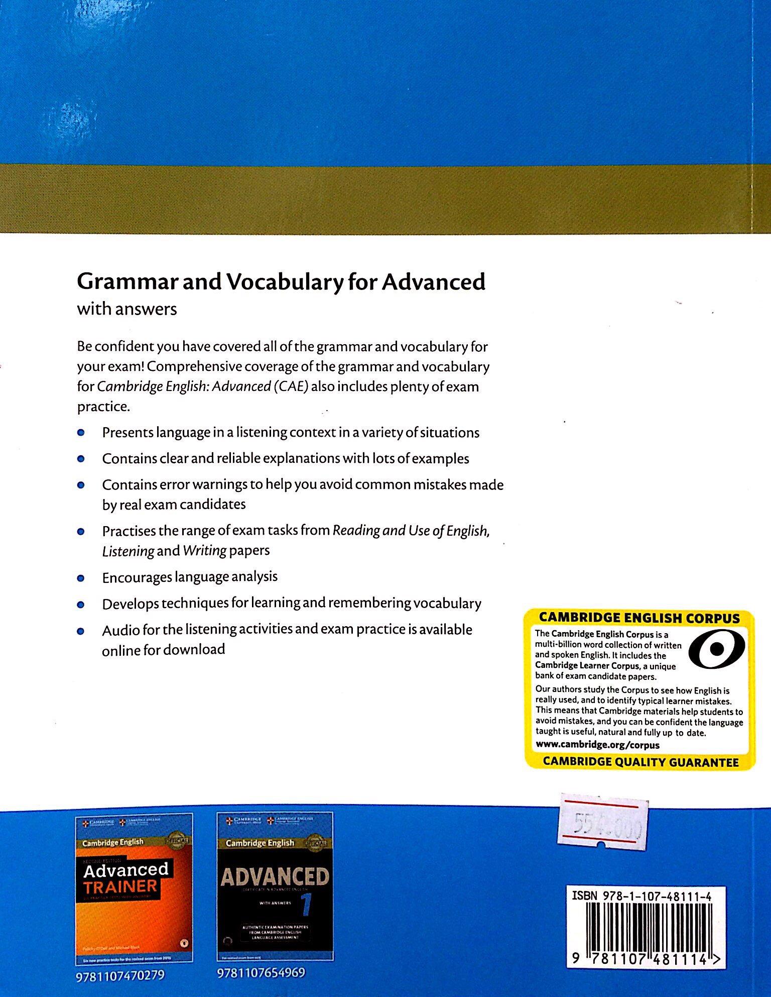 Grammar and Vocabulary reference and practice for the revised Cambridge English: Advanced (CAE) from 2015 Cambridge Grammar for CAE and Proficiency provides complete coverage of the grammar needed for both CAE and Proficiency with plenty of exam practice at the same time. Grammar is presented in a listening context giving students the chance to hear it being used in realistic situations and making it easier to remember. It includes the full range of exam tasks from the Reading, Writing and Listening papers and shows how grammar knowledge is tested in each of these. Informed by the Cambridge Learner Corpus, grammar is presented in genuine contexts and the book covers the errors students really make.