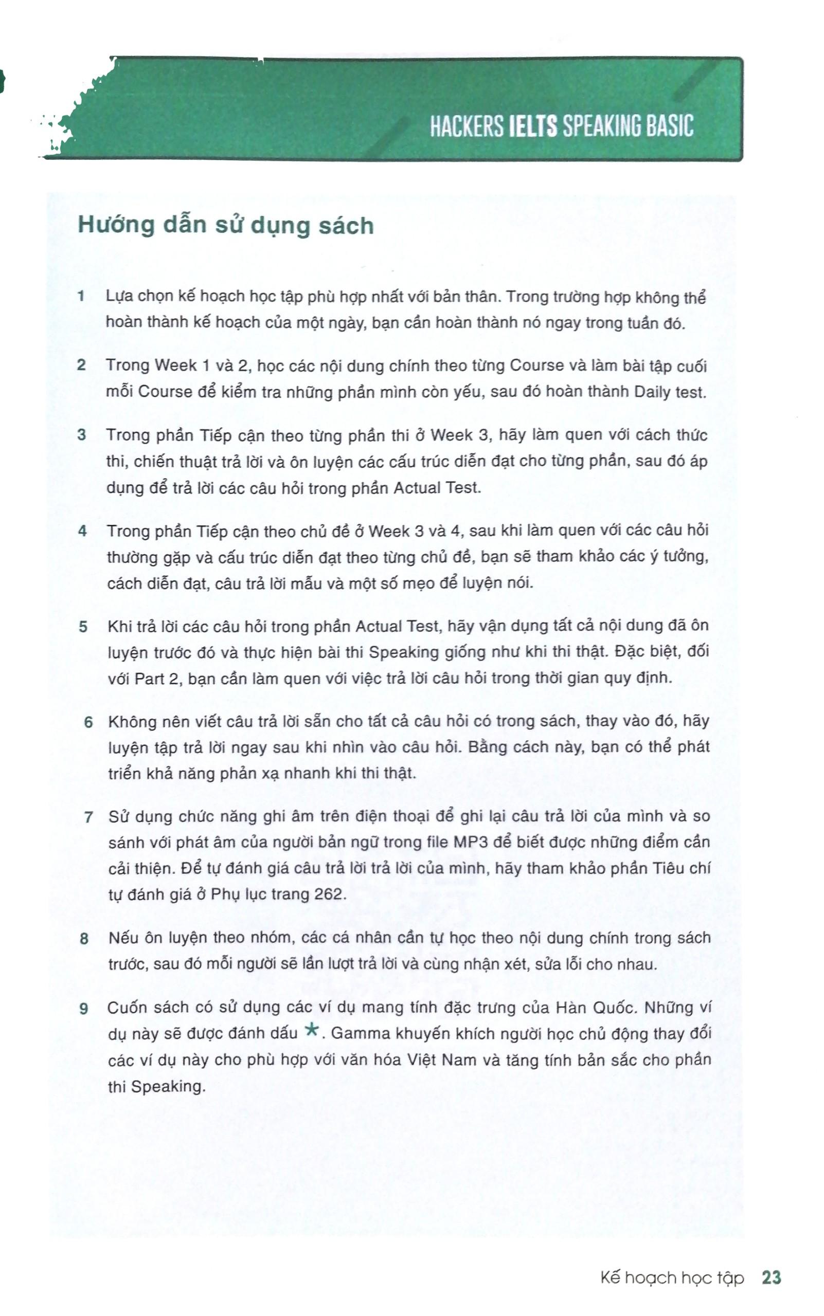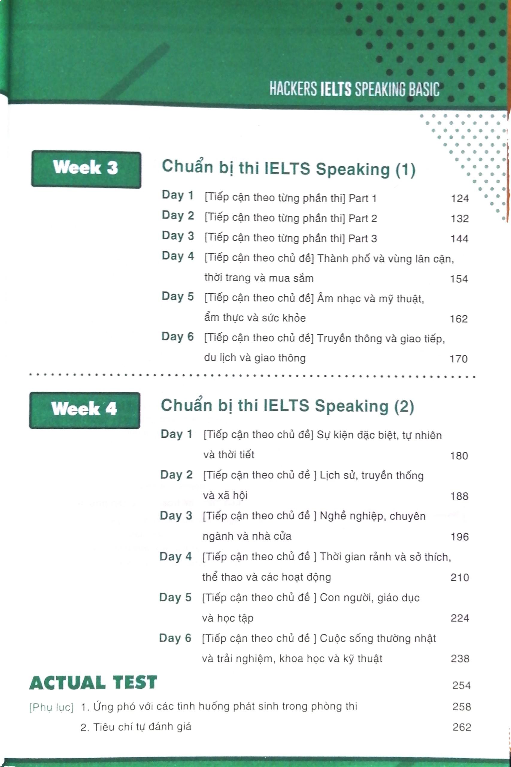 Week 1, ngữ pháp ở Week 2, làm quen với các cấu trúc diễn đạt cũng như nắm chắc chiến thuật trả lời ở Week 3 và 4, người học có thể thử sức với các câu hỏi thường gặp trong xu hướng ra đề thi mới nhất và tự bổ sung, hoàn thiện câu trả lời