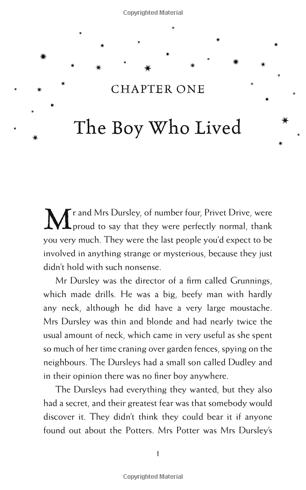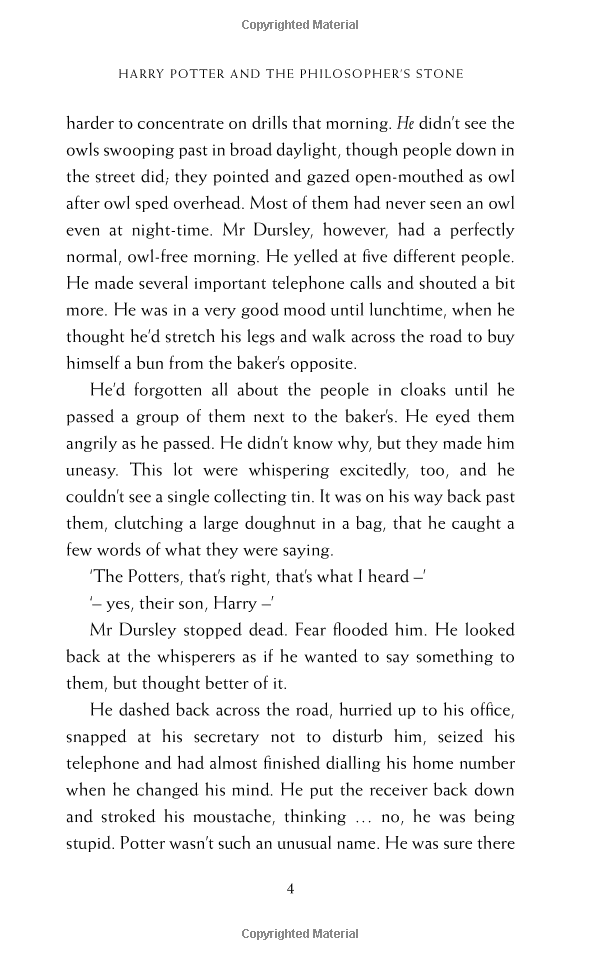 Harry Potter has never even heard of Hogwarts when the letters start dropping on the doormat at number four, Privet Drive. Addressed in green ink on yellowish parchment with a purple seal, they are swiftly confiscated by his grisly aunt and uncle. Then, on Harry's eleventh birthday, a great beetle-eyed giant of a man called Rubeus Hagrid bursts in with some astonishing news: Harry Potter is a wizard, and he has a place at Hogwarts School of Witchcraft and Wizardry.
