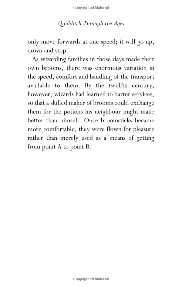 If you have ever asked yourself where the Golden Snitch came from, how the Bludgers came into existence, or why the Wigtown Wanderers have pictures of meat cleavers on their robes, you need QUIDDITCH THROUGH THE AGES. This invaluable volume is consulted by young Quidditch fans on an almost daily basis.