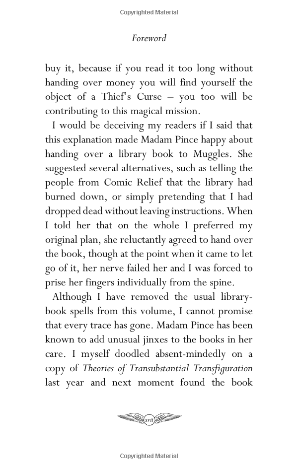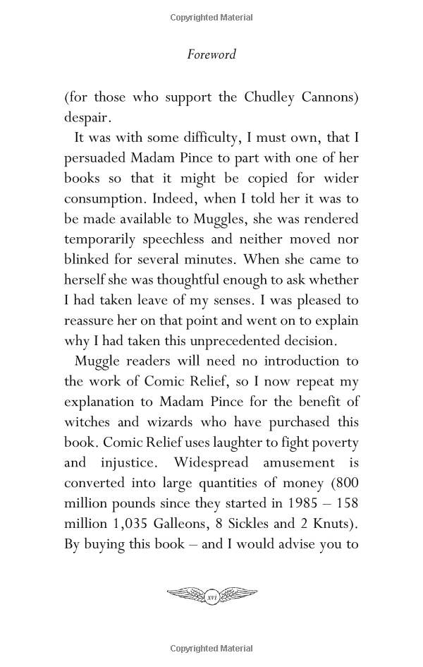 Proceeds from the sale of this book will go to Comic Relief, who will use your money to continue improving and changing lives -- work that is even more important and astonishing than the three-and-a-half-second capture of the Golden Snitch by Roderick Plumpton in 1921.