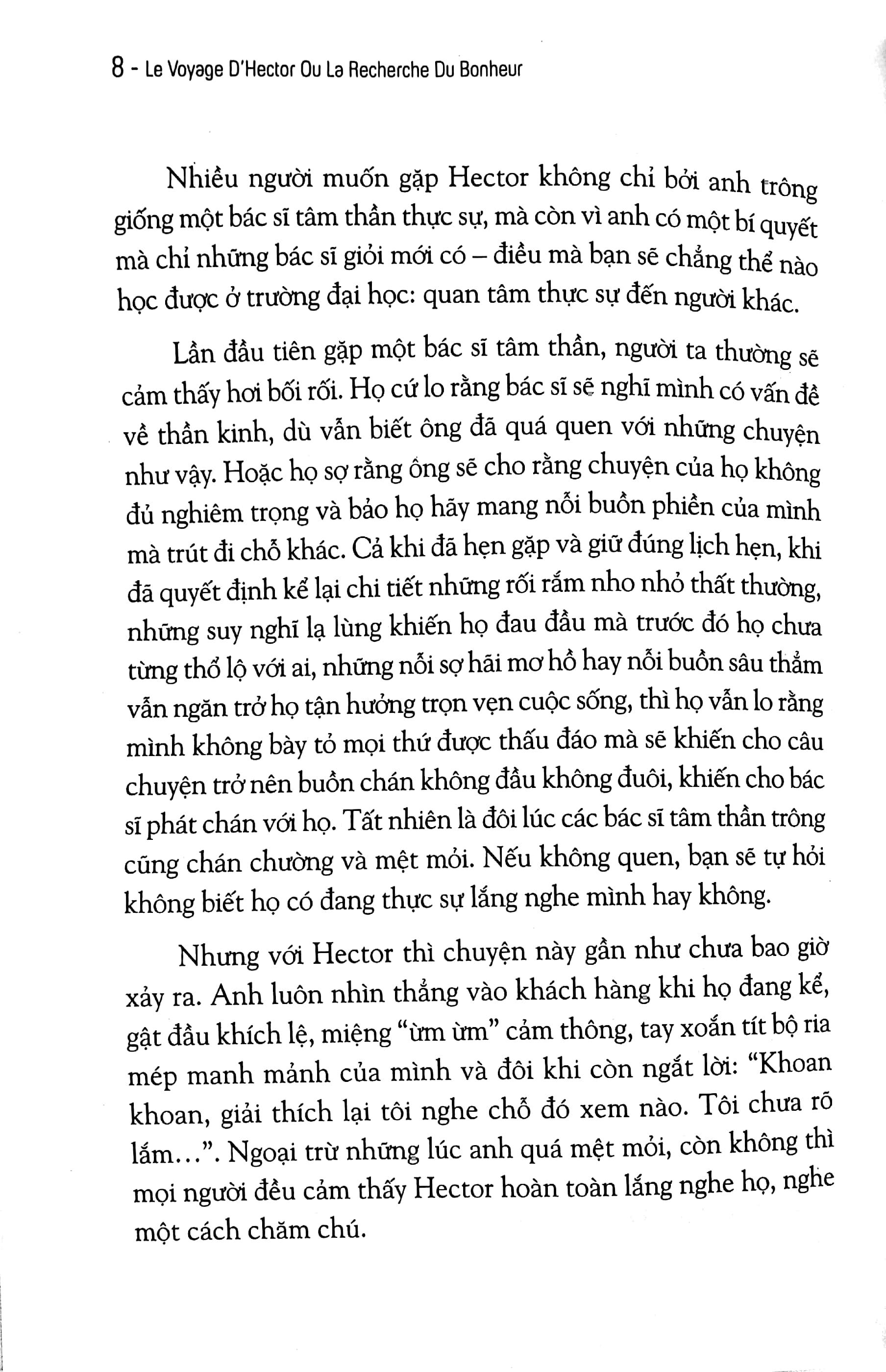 Hạnh phúc có hình hài như thế nào và vì sao có một số người dễ dàng có được hạnh phúc còn người khác lại phải vật vã khó khăn? Có thể bạn sẽ tìm được câu trả lời của mình qua hành trình tìm hạnh phúc của Hector, một hành trình thú vị, đầy tính nhân văn mà ai cũng nên bắt đầu để có câu trả lời thỏa đáng về hạnh phúc cho chính mình.