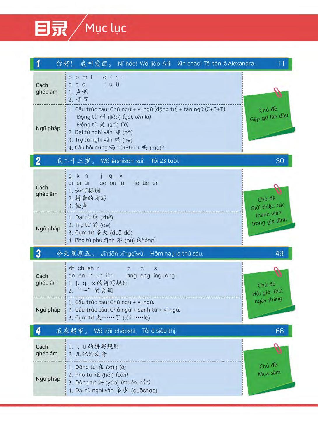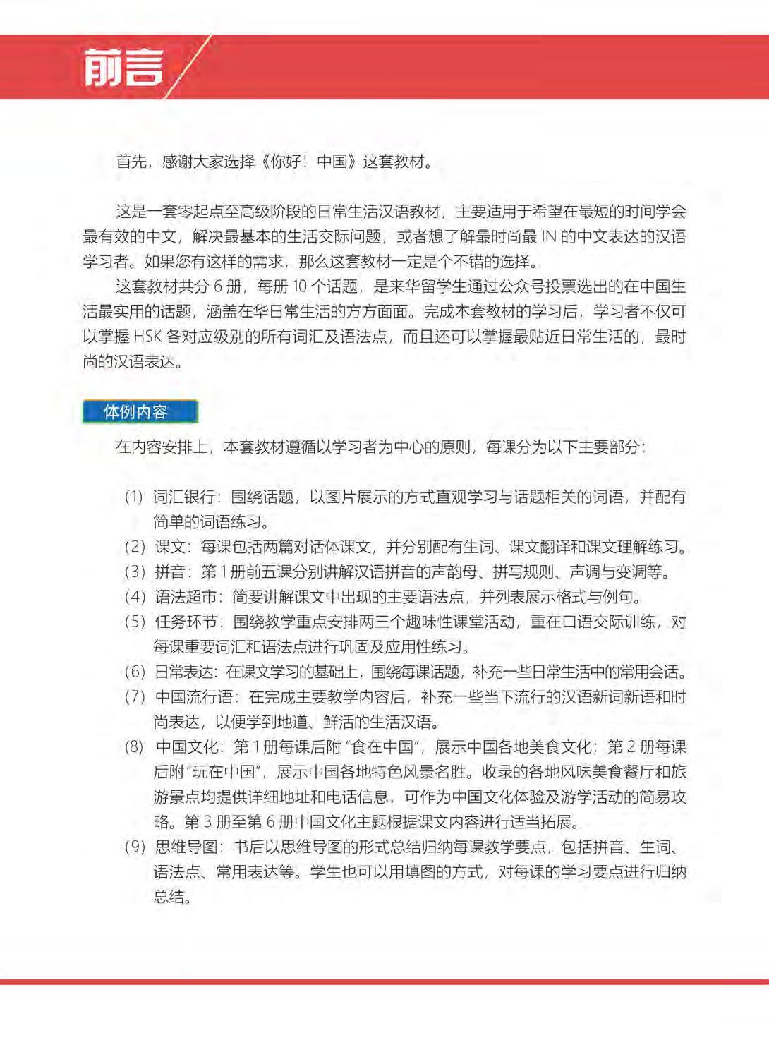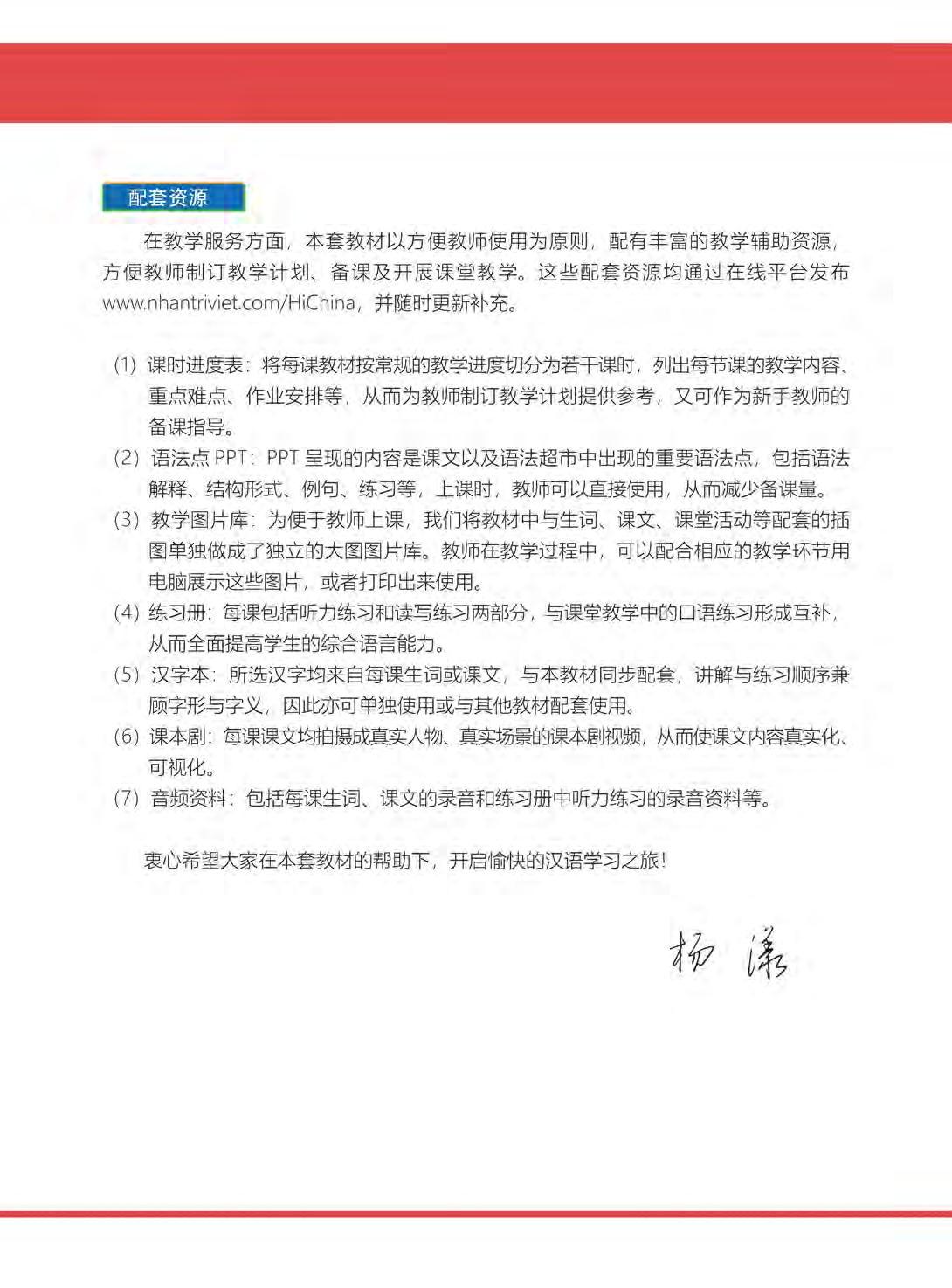 Giáo trình dạy tiếng Trung từ cấp độ vỡ lòng đến nâng cao Hi! China có thể giúp bạn đạt được cùng lúc cả hai mục tiêu trên. Giáo trình gồm 6 quyển, mỗi quyển có 10 bài. Bộ sách này cung cấp kiến thức ngữ pháp thông qua những đoạn hội thoại trong nhiều tình huống, tập trung vào các hoạt động lấy người học làm trung tâm, chú trọng việc thực hành và rèn luyện kỹ năng giao tiếp trong cuộc sống thường ngày. Mặt khác, từ vựng, ngữ pháp và các chủ đề trong 6 quyển của giáo trình lần lượt tương ứng với 6 cấp độ của đề thi HSK, nhờ vậy giáo trình giúp học viên đáp ứng được yêu cầu của đề thi và có thể được sử dụng làm tài liệu luyện thi HSK.