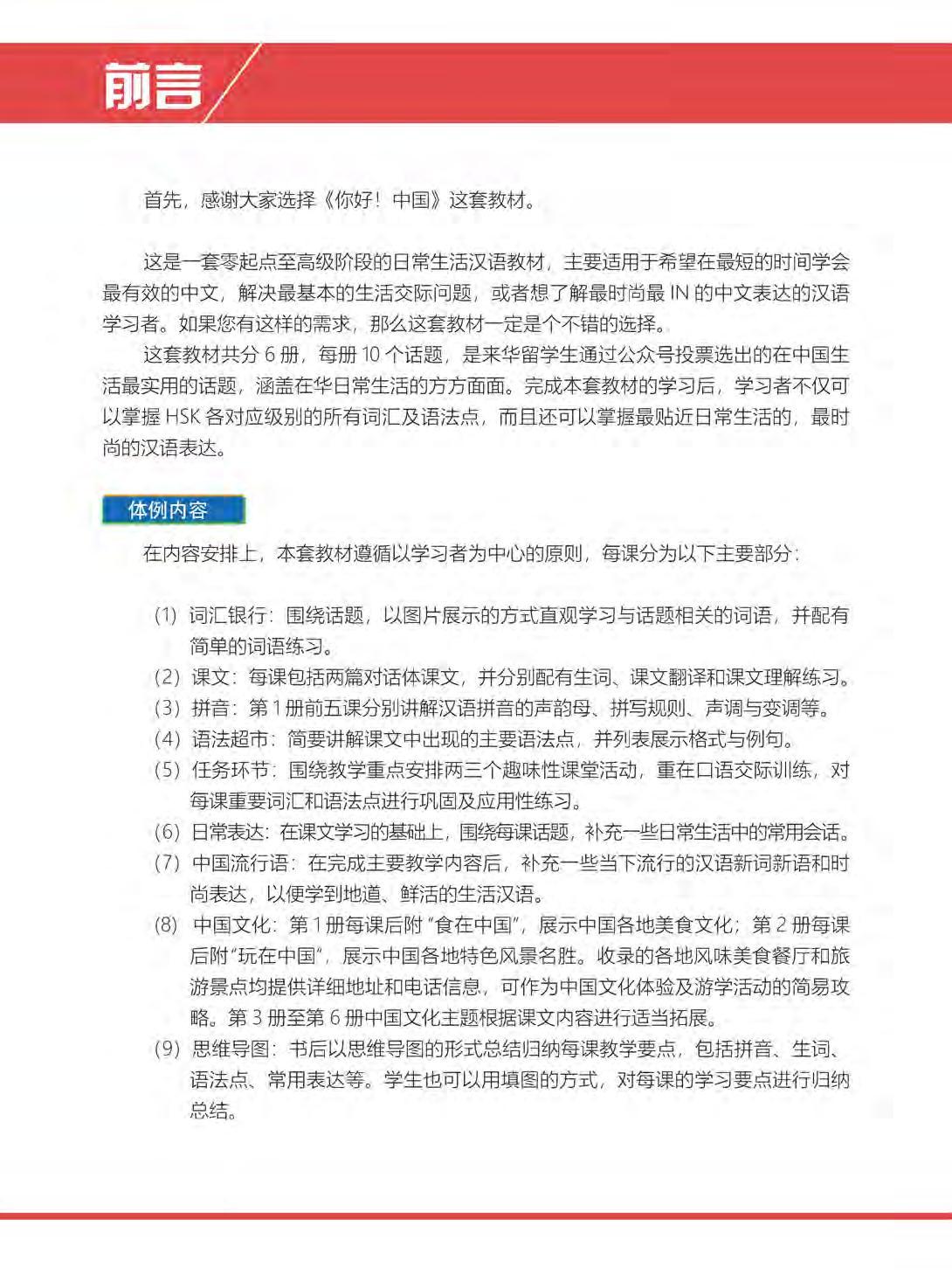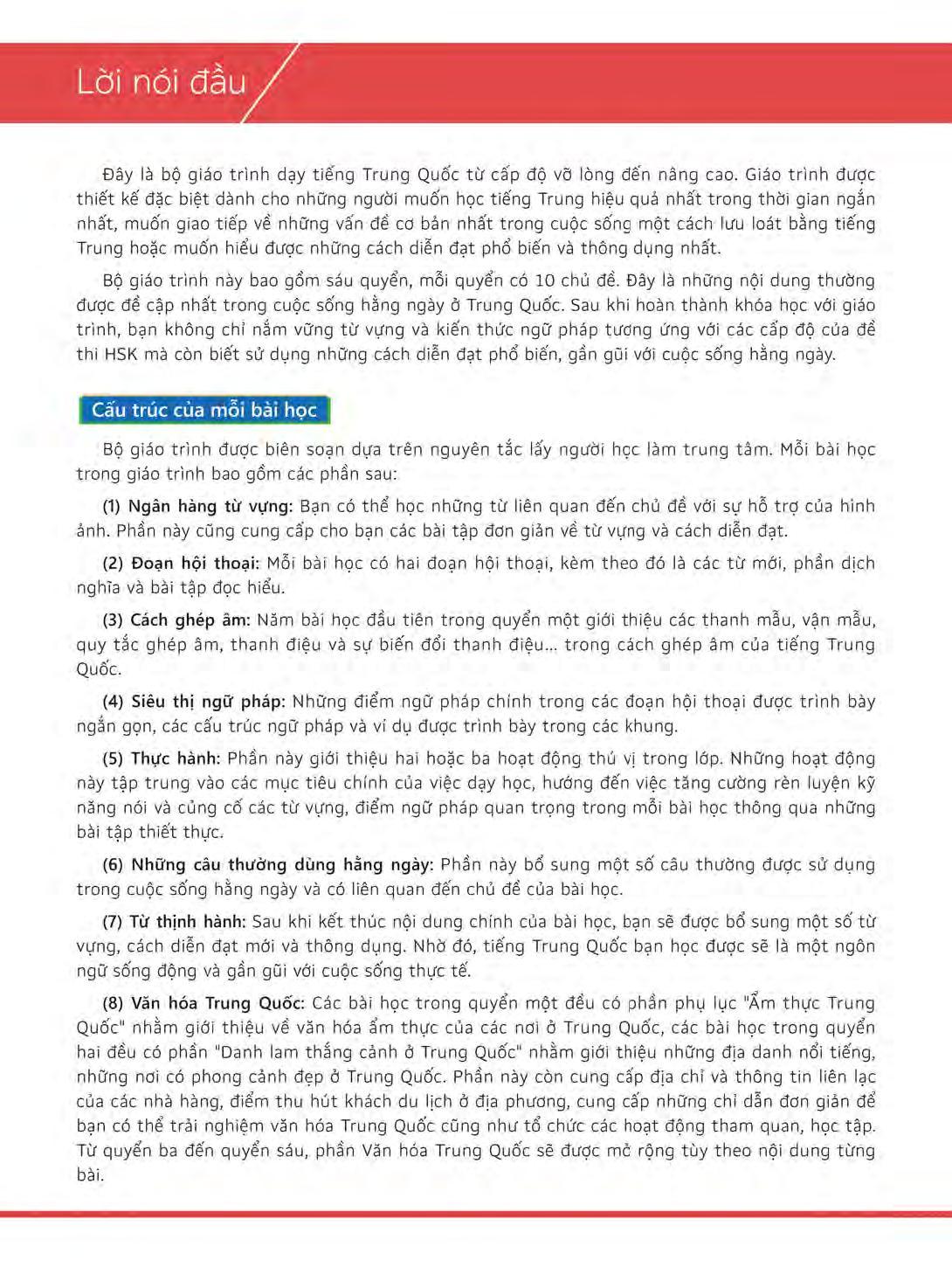 Giáo trình dạy tiếng Trung từ cấp độ vỡ lòng đến nâng cao Hi! China có thể giúp bạn đạt được cùng lúc cả hai mục tiêu trên. Giáo trình gồm 6 quyển, mỗi quyển có 10 bài. Bộ sách này cung cấp kiến thức ngữ pháp thông qua những đoạn hội thoại trong nhiều tình huống, tập trung vào các hoạt động lấy người học làm trung tâm, chú trọng việc thực hành và rèn luyện kỹ năng giao tiếp trong cuộc sống thường ngày. Mặt khác, từ vựng, ngữ pháp và các chủ đề trong 6 quyển của giáo trình lần lượt tương ứng với 6 cấp độ của đề thi HSK, nhờ vậy giáo trình giúp học viên đáp ứng được yêu cầu của đề thi và có thể được sử dụng làm tài liệu luyện thi HSK.