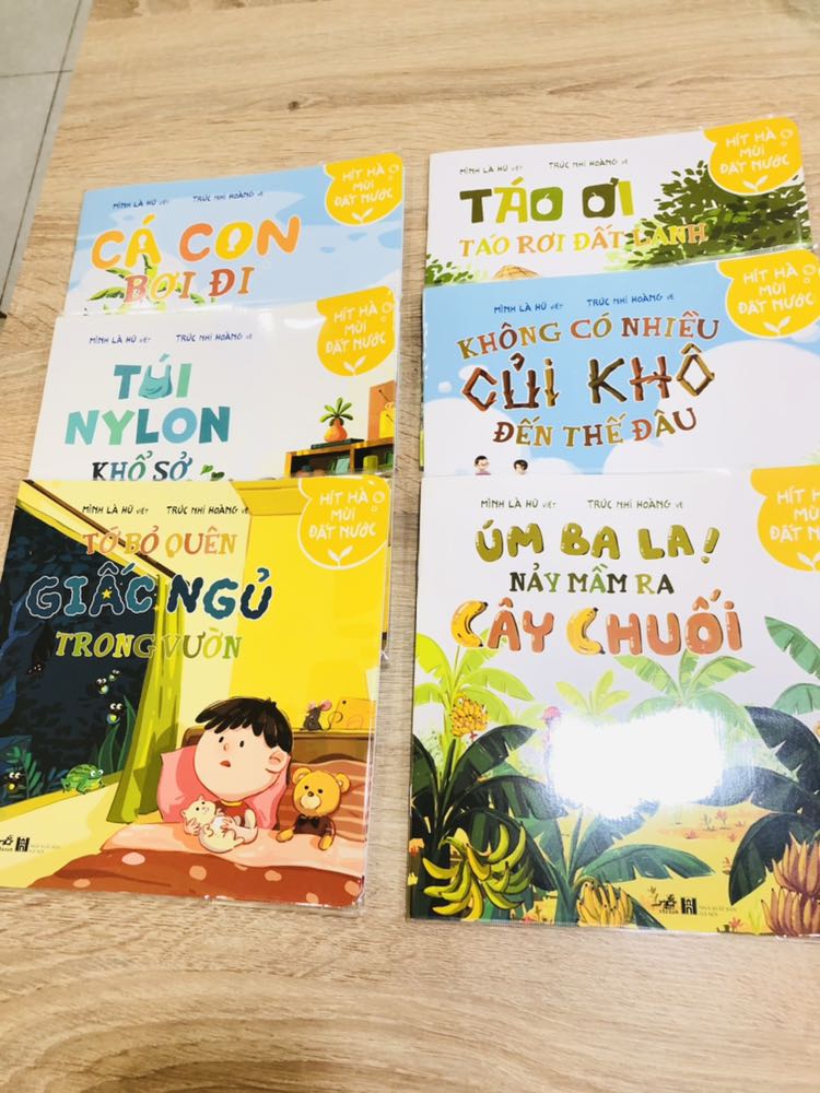 - Bộ sách Hít hà mùi đất nước gồm 6 cuốn tranh màu nhỏ xinh, hướng đến độc giả cuối mẫu giáo đầu tiểu học để tạo dựng và định hình nhận thức xanh-sạch-hiểu sâu về thiên nhiên xung quanh ta. Nhân vật chính là em Tôm 6 tuổi luôn tò mò về thế giới xung quanh, rất yêu thiên nhiên và ham học học, đồng thời cũng khá ngang bướng và hiếu động, như nhiều trẻ em nước ta. Các câu chuyện diễn ra trong bối cảnh làng quê Việt Nam từ Bắc vào Nam với những cỏ cây hoa lá, tôm cá cua còng thuần Việt, với cả những tác phong sinh hoạt đương đại của người Việt ta nữa. Từ từng chi tiết sâu ăn táo, nuôi thả cá con đến kỳ sinh nở, chọn hàng gói lá chuối ngoài chợ, những tàu lá chuối rợp che giấc ngủ trưa hè, những mầm cây mọc lên từ hạt quả rơi vãi… các độc giả nhỏ hiểu dần về cây cối con vật xung quanh mình, lắng nghe “tiếng nói” của mọi loài sinh vật, từ đó nghĩ ra cách tương tác với Mẹ thiên nhiên sao cho an lành và để các bên cùng được sinh sôi.