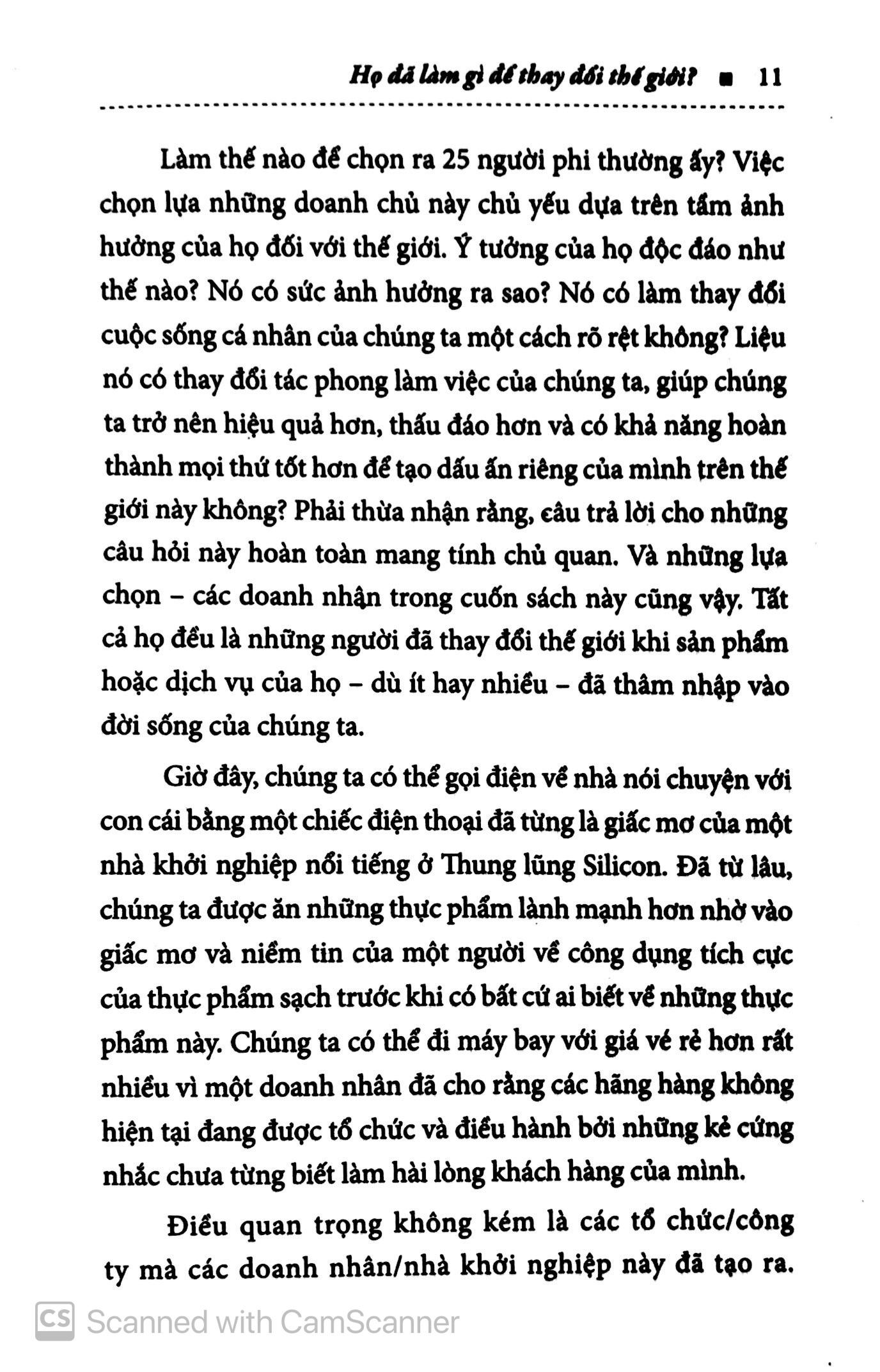 Nhìn lại con đường khởi nghiệp của các doanh nhân thành đạt này, chúng ta còn cảm phục ý chí, nghị lực, sự kiên cường và cả nhân cách cao quý của họ. Chính những tính cách đó đã góp phần đưa tên tuổi của họ lưu danh trên thế giới. Và điều quan trọng nhất là các sản phẩm hoặc dịch vụ của họ, dù ít hay nhiều, đã thực sự thay đổi cuộc sống của chúng ta.