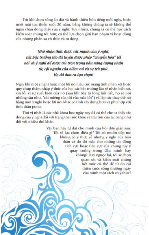 Cách trình bày màu mè đẹp mắt nhưng nội dung vô cùng nhạt nhẽo và cũ rích, góp nhặt lượm lặt từ những quyển sách self help khác. Đọc chưa đầy 15p đã hết cuốn sách vì đọc câu đầu đã đoán dc nội dung của cả đoạn. Đọc sách triết học hoặc tâm lý học Afred Adler xứng đáng hơn nhiều. Cực kỳ không khuyên quý vị nên mua.