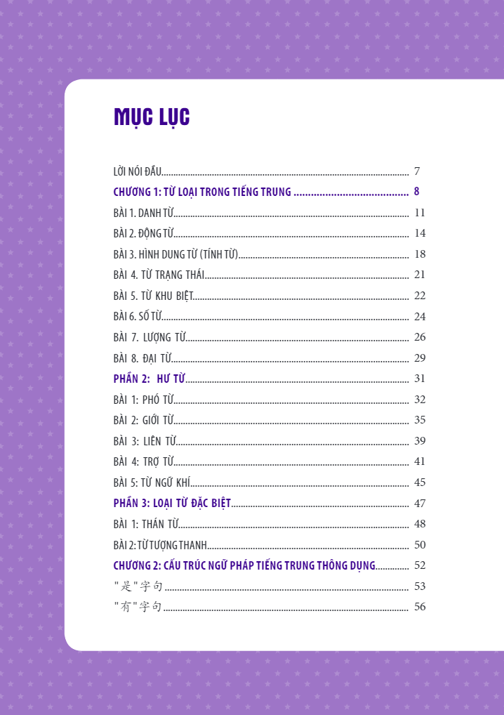 Cuốn sách gồm có hai chương chính cũng là hai điểm cần nắm vững trong hệ thống ngữ pháp tiếng Trung là: từ loại và các cấu trúc ngữ pháp tiếng Trung thường gặp. Nội dung mỗi phần đều được minh họa bằng những hình ảnh trực quan sinh động, sắp xếp theo sơ đồ tư duy, giúp bạn đọc học và ghi nhớ kiến thức một cách hệ thống. Ngoài ra, trong mỗi phần cấu trúc cơ bản, tác giả còn biên soạn bài tập ngắn để thực hành và củng cố lại kiến thức ngữ pháp được giới thiệu trong bài.