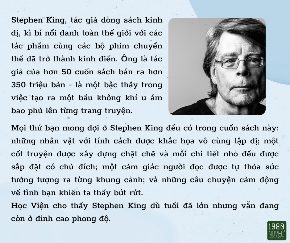 Bên cạnh Bản đặc biệt The Institute ( Học Viện) làm nức lòng người hâm mộ ông hoàng truyện kinh dị Stephen King, 1980Books tiếp tục ra mắt bản thường của Học Viện để đưa tác phẩm đến gần với đông đảo người hâm mộ truyện hơn.Học Viện là tác phẩm áp út của tác giả bán được hơn 350 triệu cuốn sách trên toàn thế giới, Stephen King.