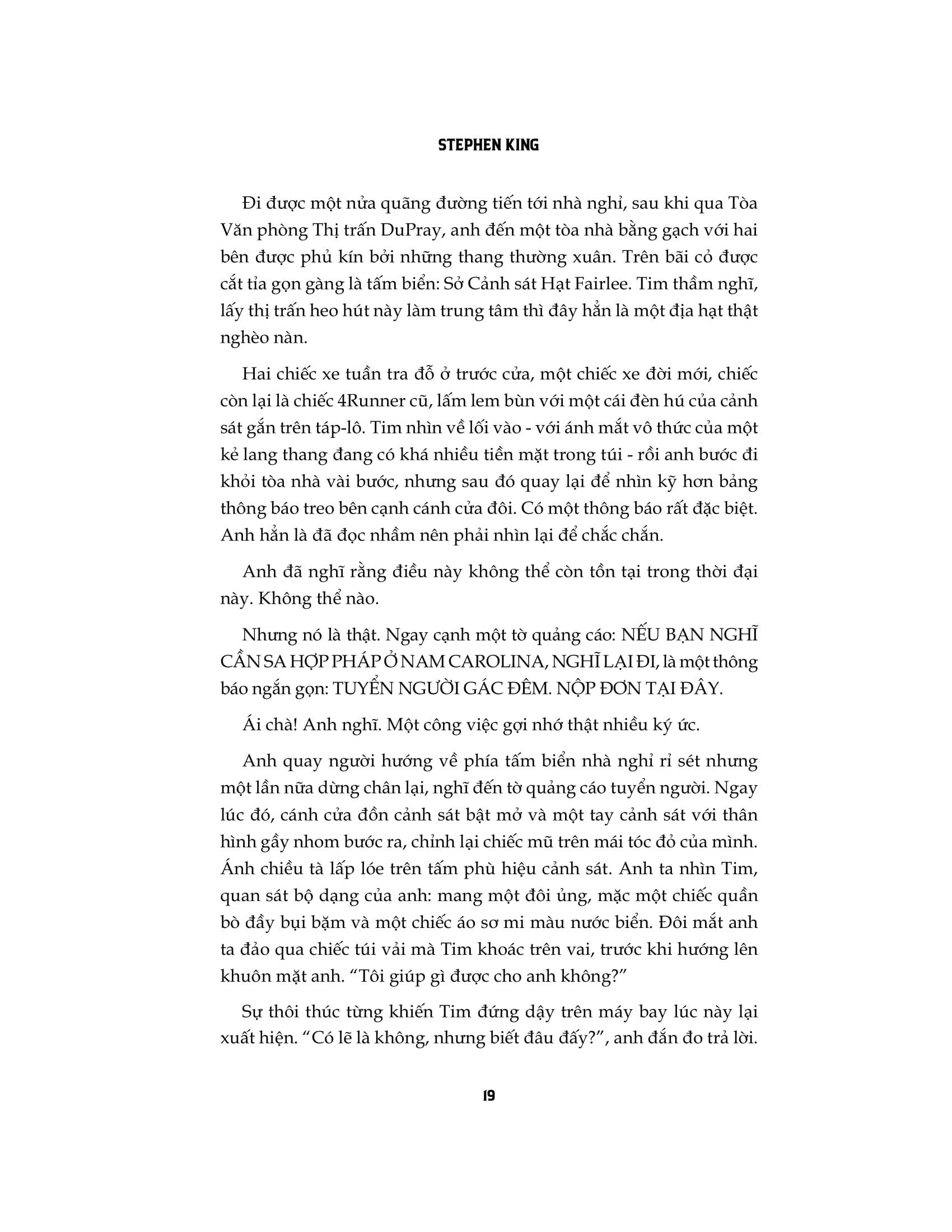 Độc giả không còn xa lạ với cái tên Stephen King, tác giả dòng sách kinh dị, kì bí nổi danh toàn thế giới với các tác phẩm cùng các bộ phim chuyển thể đã trở thành kinh điển.