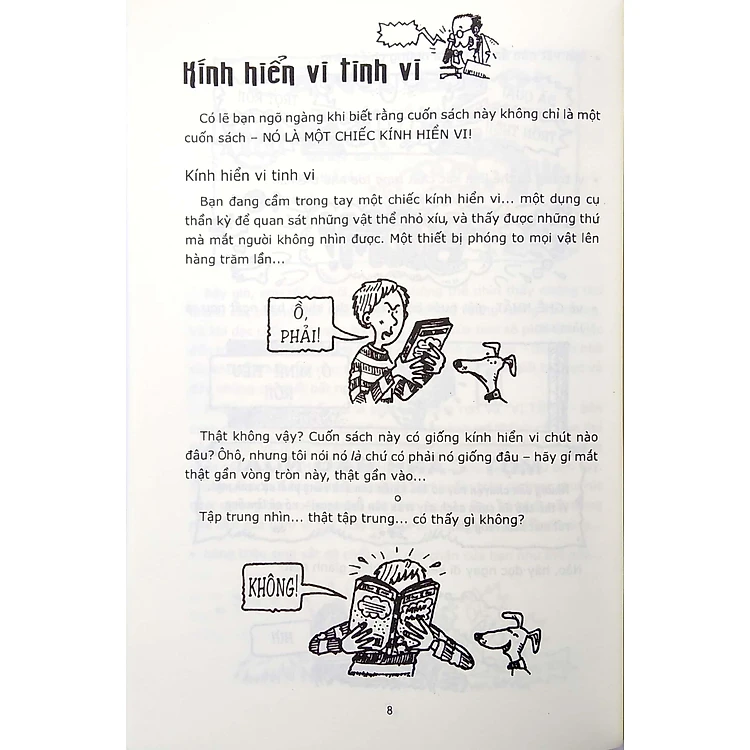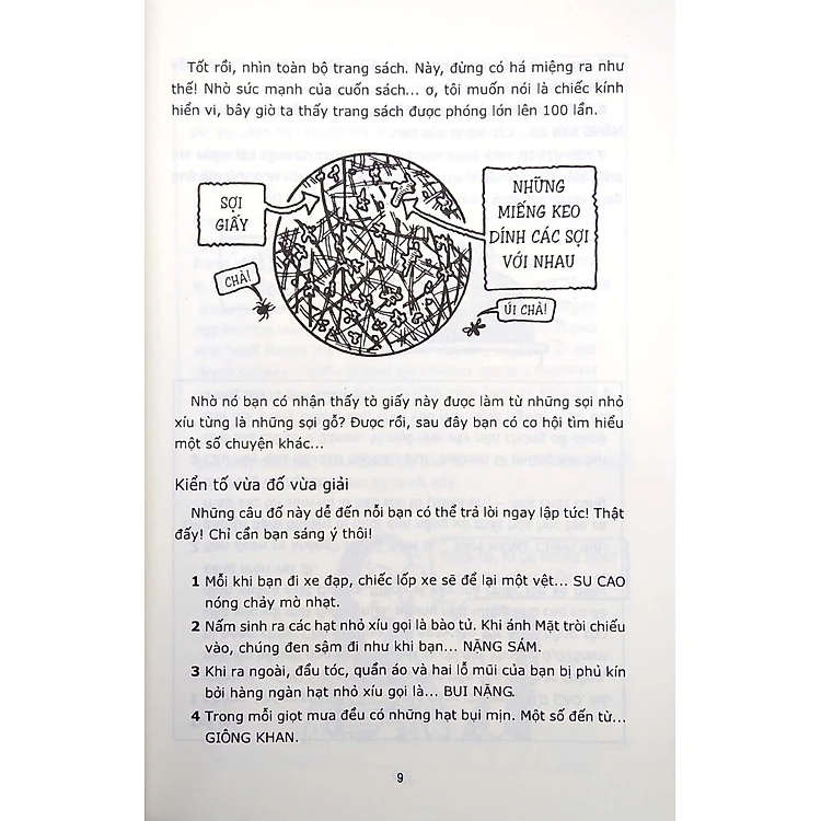 - "Tốt rồi, nhìn toàn bộ trang sách. Này, đừng có há miệng ra như thế! Nhỏ sức mạnh của cuốn sách... ơ, tôi muốn nói là chiếc kính hiển vi, bây giờ ta thấy trang sách được phóng lớn lên 100 lần.