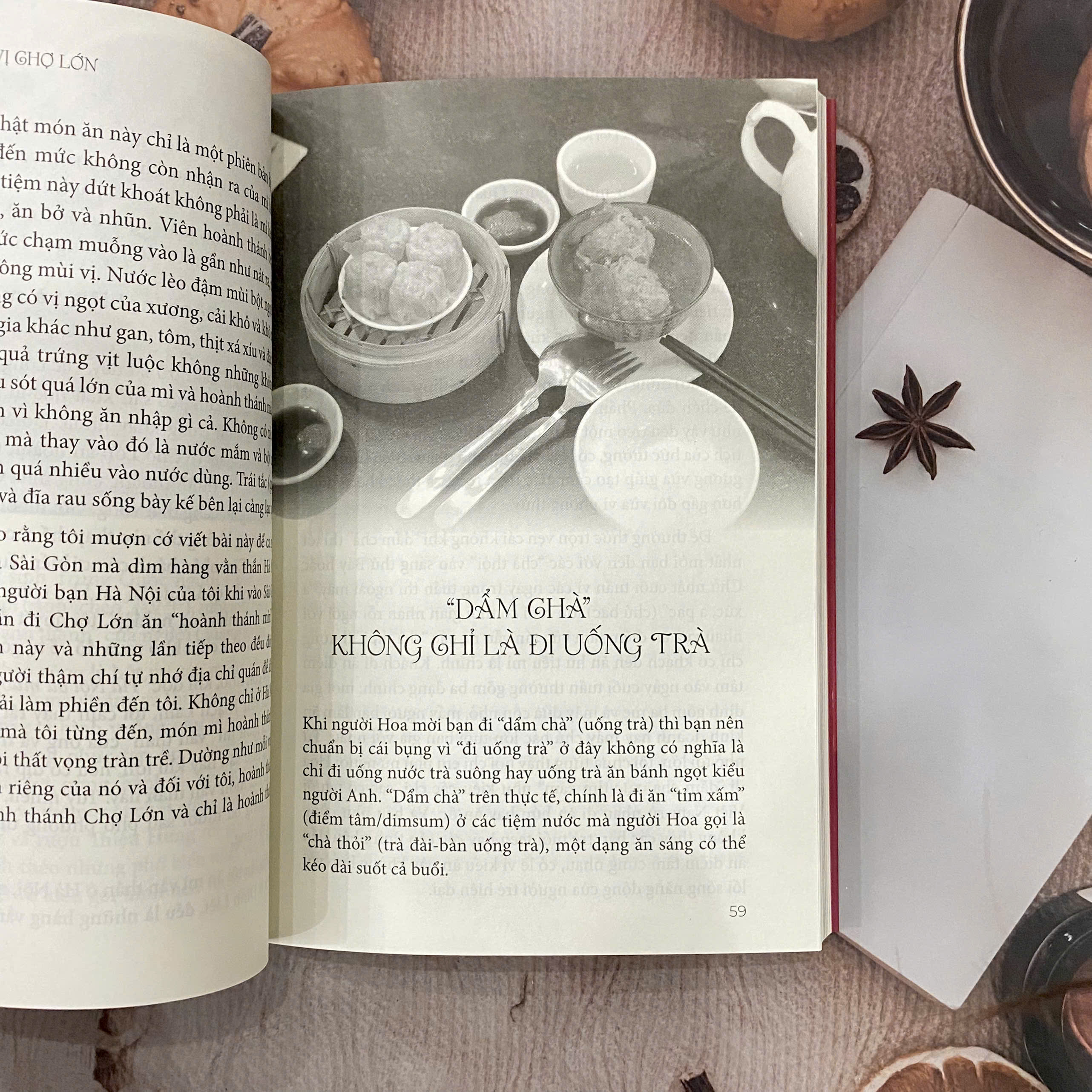 Trang sách mở ra không phải bằng sự phô diễn cầu kỳ của món ngon, mà bằng giọng kể chậm rãi, thân thuộc, như một người con Chợ Lớn đang thủ thỉ về tuổi thơ mình. Ở đó có tô hủ tiếu mì nước đục đã ăn từ thuở nhỏ, có buổi “dẩm chà” không chỉ để uống trà mà để tụ họp, có chiếc bánh bao nóng hổi trên tay buổi sáng, có ly nước sâm mát lạnh gắn với những buổi trưa oi ả. Mỗi món ăn hiện lên không chỉ bằng vị giác, mà bằng cảm giác: cảm giác bình yên của những điều quen thuộc lặp đi lặp lại qua nhiều thế hệ.