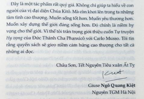 Cuốn sách cực kỳ hay. Không phải là người Công giáo nên tôi hoàn toàn về tác phẩm vì sách không nặng về tôn giáo mà chỉ là câu chuyện về cuộc đời của Đức Thánh Cha, góc nhìn của Ngài về những gì Ngài trải qua. Cảm phục Đức Thánh Cha - bậc đáng kính.