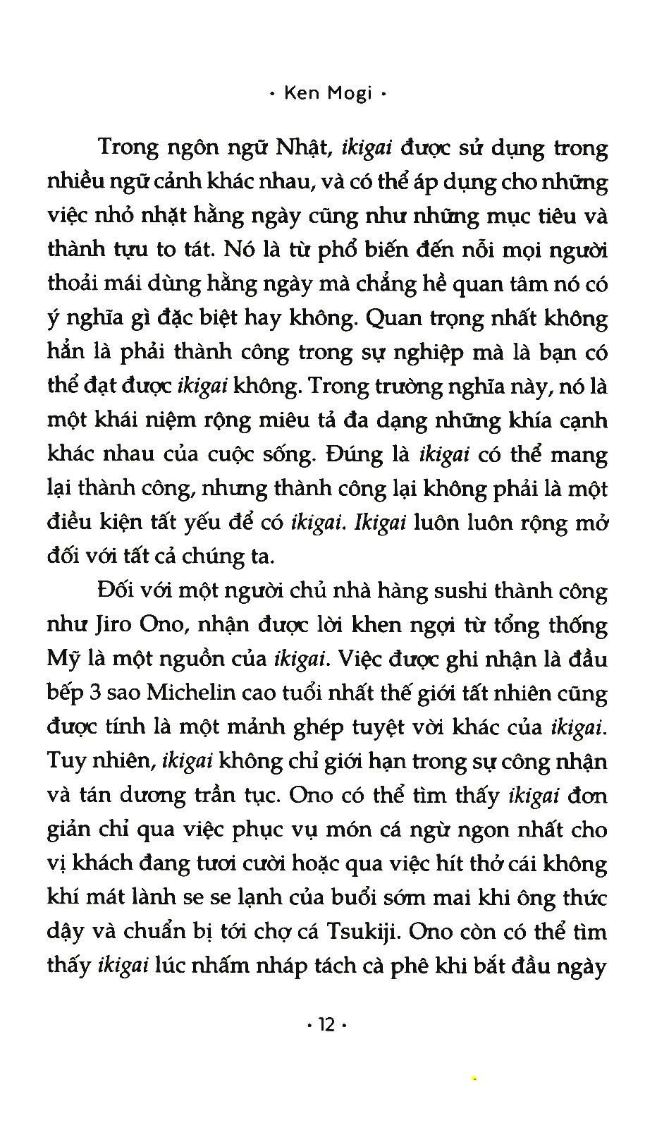 Nhưng làm thế nào để bạn tìm được ikigai của mình? Có nhất thiết phải có sự nghiệp thành công như Jiro Ono – ông chủ nhà hàng Sukiyabashi Jiro, nơi vinh dự được tiếp đón Obama, hay phải trở thành một yokozuna trong môn vật sumo mới đạt tới ikigai? Thông qua những nghiên cứu khoa học và từ chính trải nghiệm của bản thân, Ken Mogi mang tới cho độc giả một nhận thức sâu sắc về ikigai, đồng thời hiểu thêm về lịch sử và văn hóa Nhật Bản. Những giá trị của ikigai mà bạn thu nhận từ sách có thểgiúp bạn tìm ra ikigai của mình, và quan trọng hơn hết, mỗi sớm mai thức dậy biết mình đang sống vì điều gì.