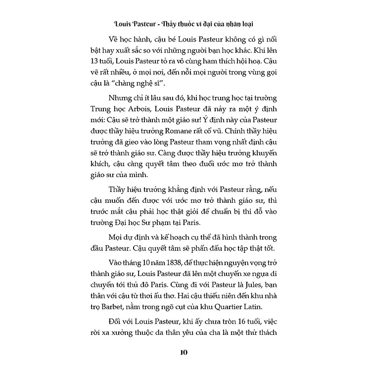 - Có thể khẳng định rằng, hiếm có người cứu sống được nhiều sinh mạng hơn Louis Pasteur. Những vắc-xin ông phát triển cho đến nay vẫn tiếp tục cứu sống và bảo vệ hàng triệu người trên thế giới. Những nghiên cứu của ông về vi trùng đã cách mạnh hóa y tế. Louis Pasteur - Thầy thuốc vĩ đại của nhân loại là cuốn sách kể về câu chuyện cuộc đời của nhà khoa học Louis Pasteur. Cuốn sách mang đến cho bạn đọc thêm những góc nhìn rất mới về ông - một cậu bé sống tình cảm và ham học, một tuổi trẻ dám dấn thân hết mình cho đam mê, một nhà khoa học không ngừng cống hiến cho nhân loại đến tận những ngày cuối đời. Trên hành trình khoa học ấy của ông không chỉ có những vinh quang, mà có cả những cay đắng, khó khăn, những sự hi sinh lặng thầm để theo đuổi đam mê khoa học của cuộc đời mình.