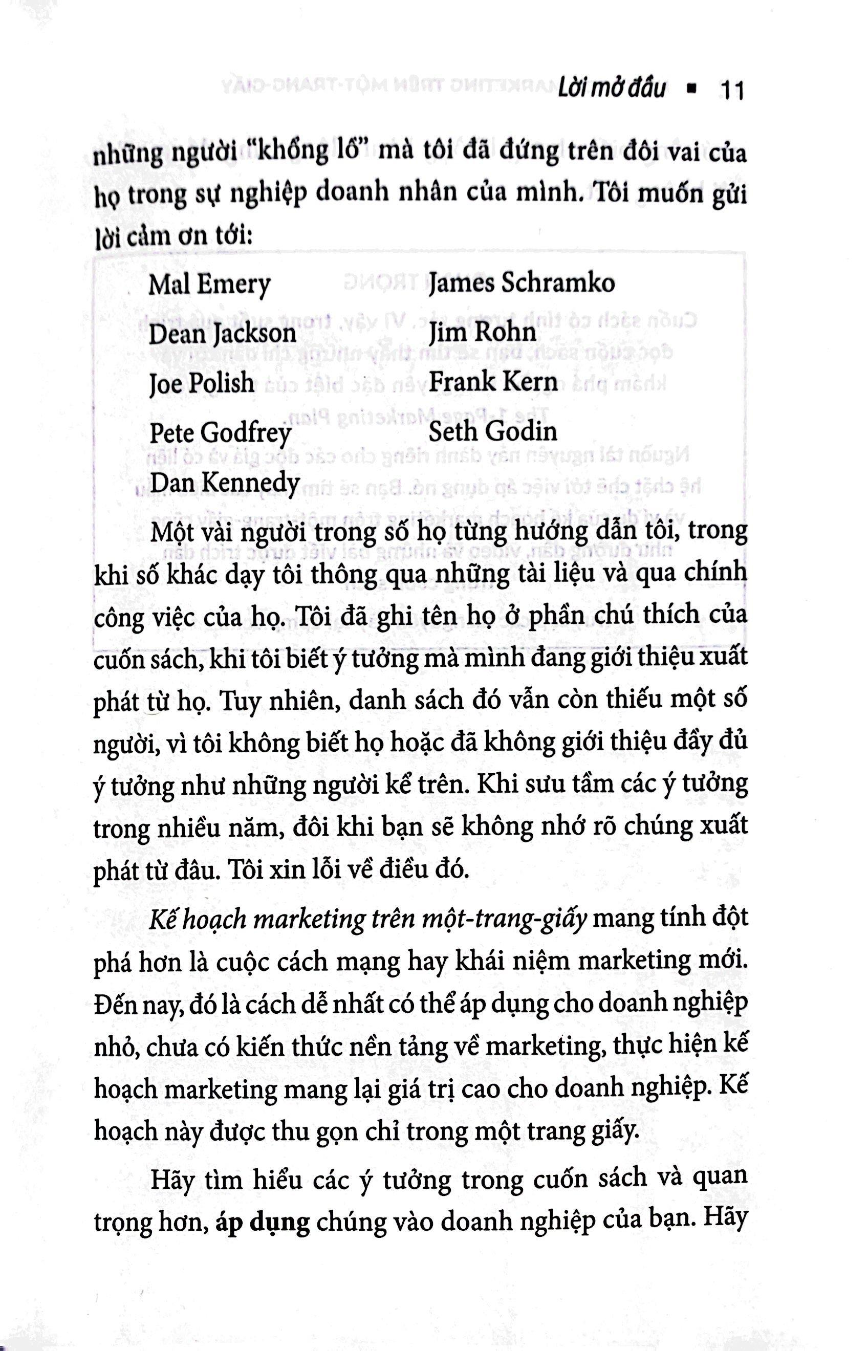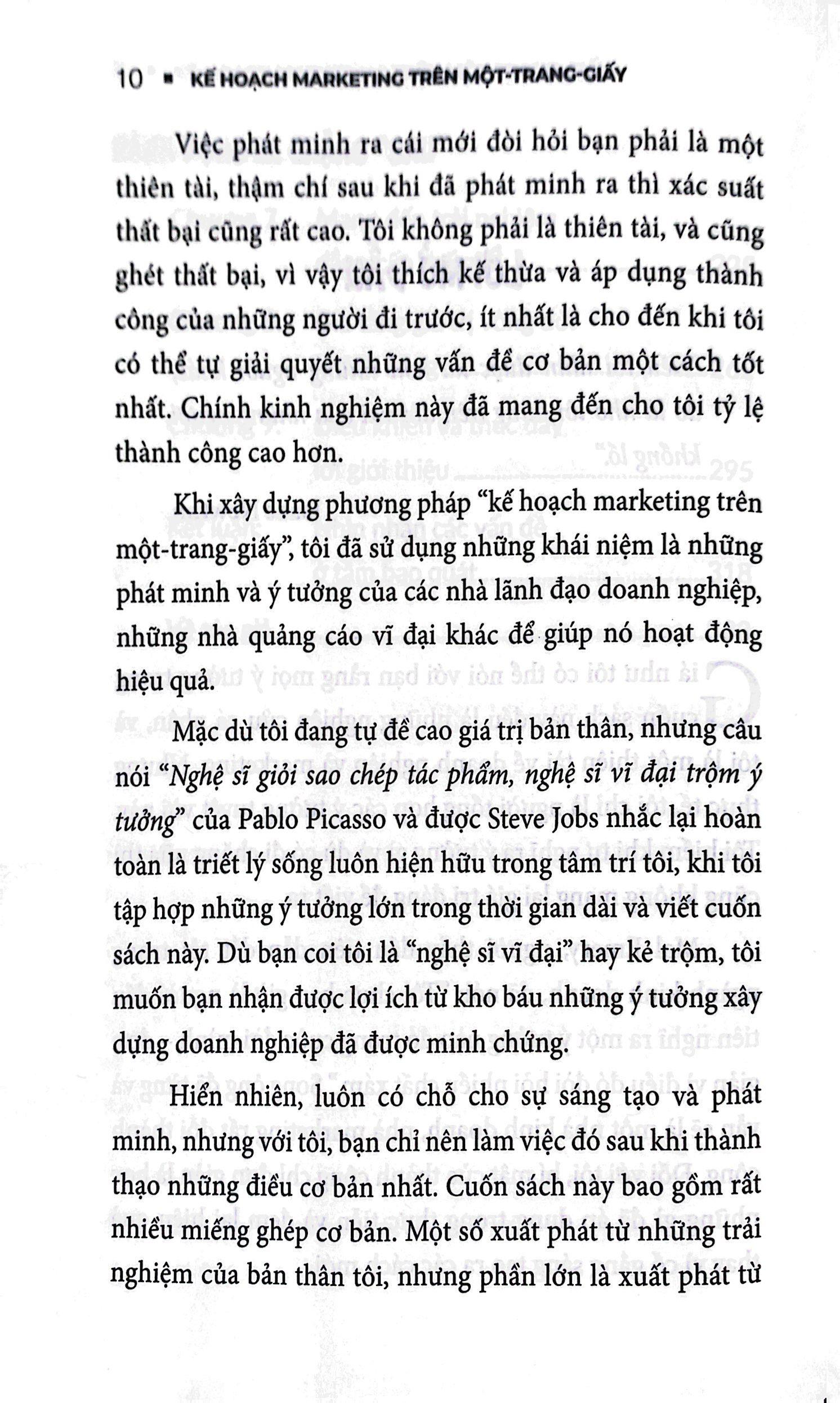 Trên thực tế, chiến lược Marketing của doanh nhân thành công Allan Dib chỉ là chín ô vuông gói gọn trong một trang giấy. Bằng việc kết hợp giữa các chiến lược, chiến thuật và các khái niệm đã được bảo chứng thành công sau nhiều thập kỷ thử nghiệm và đo lường bởi các bậc thầy về marketing phản hồi trực tiếp; cộng với những chiến lược thực tiễn do chính Allan đề xướng và áp dụng hiệu quả trong thực tiễn, Kế hoạch marketing một-trang-giấy là một bước đột phá trong khâu thực hiện. Với Kế hoạch marketing một-trang-giấy, marketing là thực sự trở thành một kỹ năng kinh doanh bậc thầy. Nó sẽ giúp doanh nghiệp của bạn thành công và quan trọng hơn thế, nó cũng giúp các doanh nghiệp và hoạt động kinh doanh khác mà bạn tham gia trong tương lai thành công.