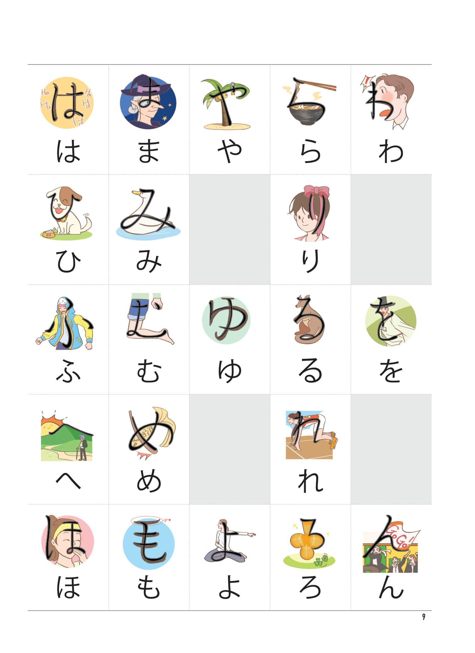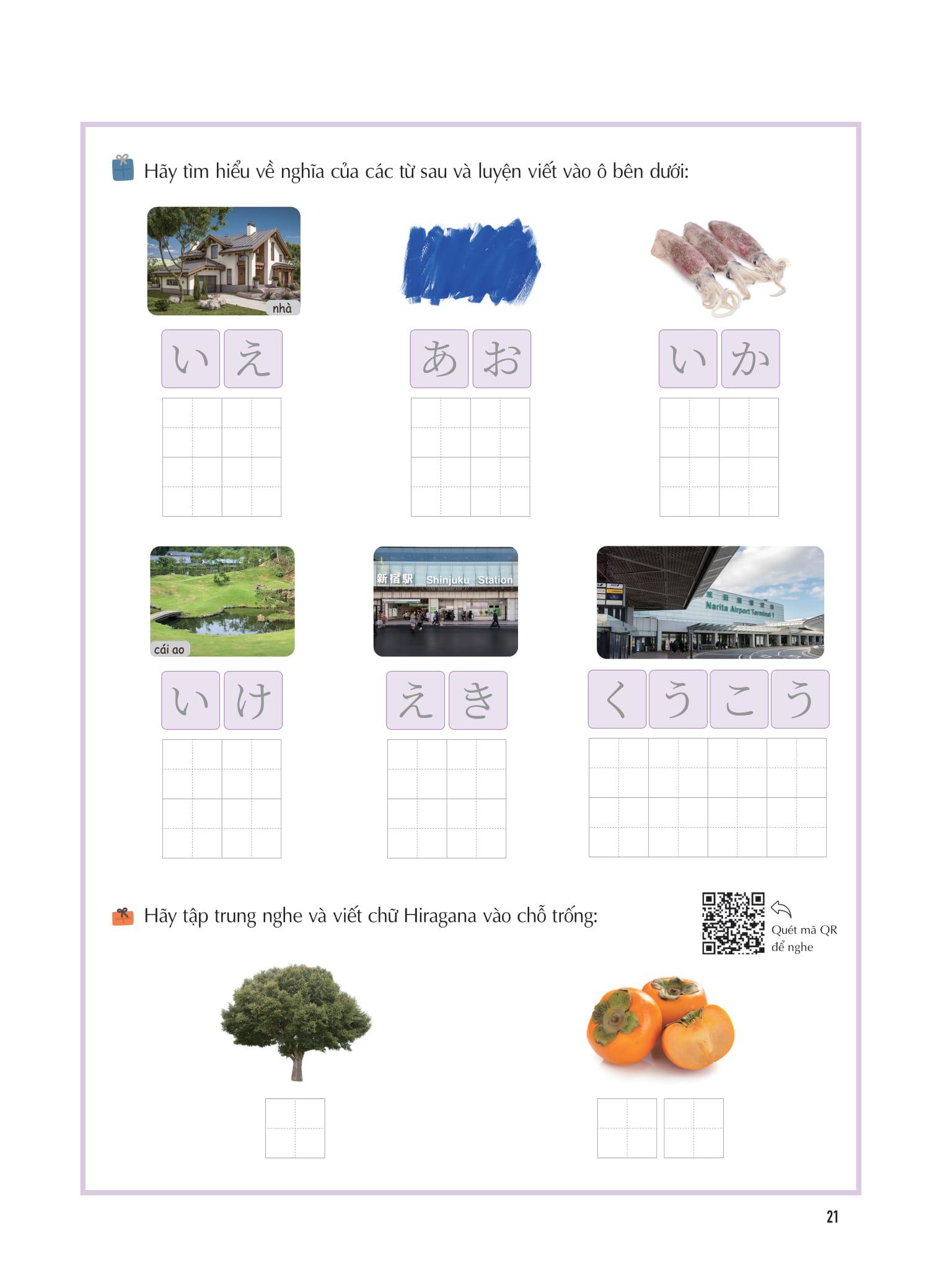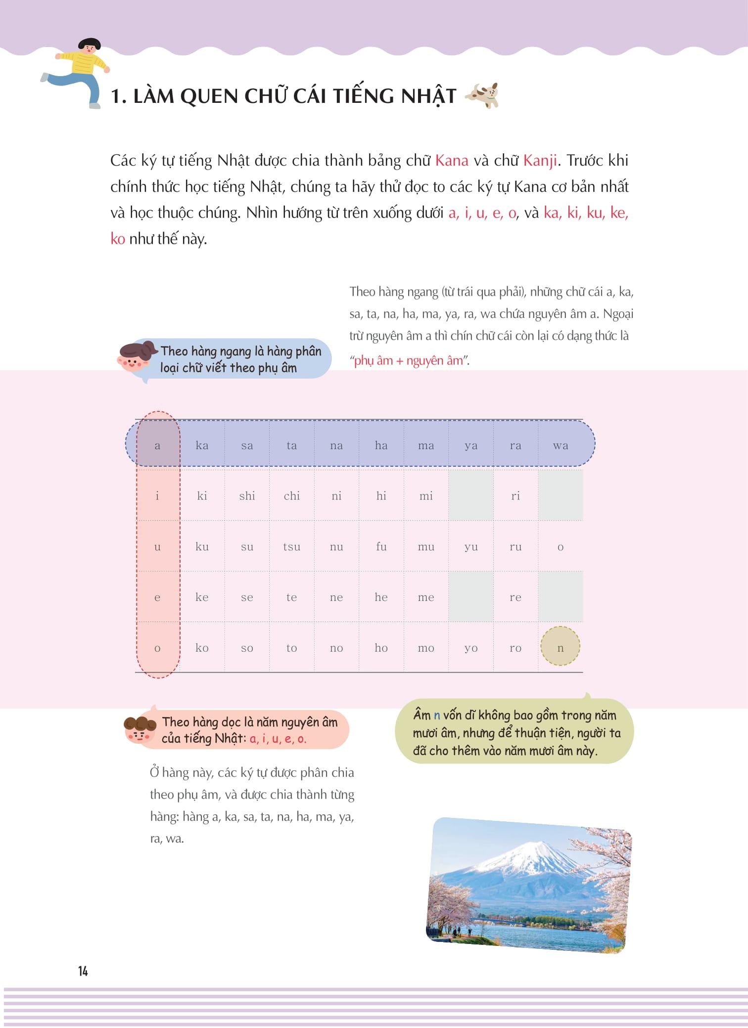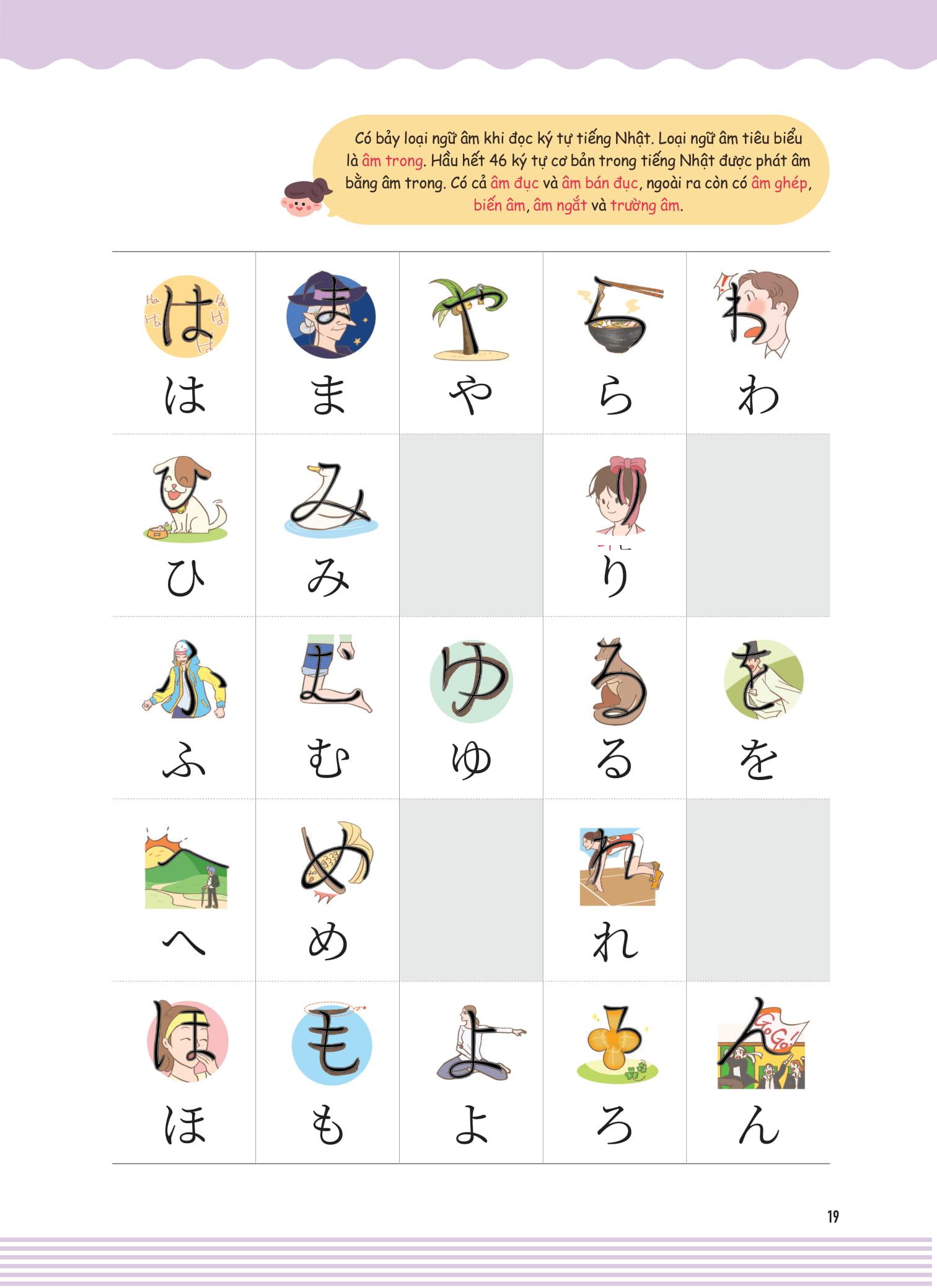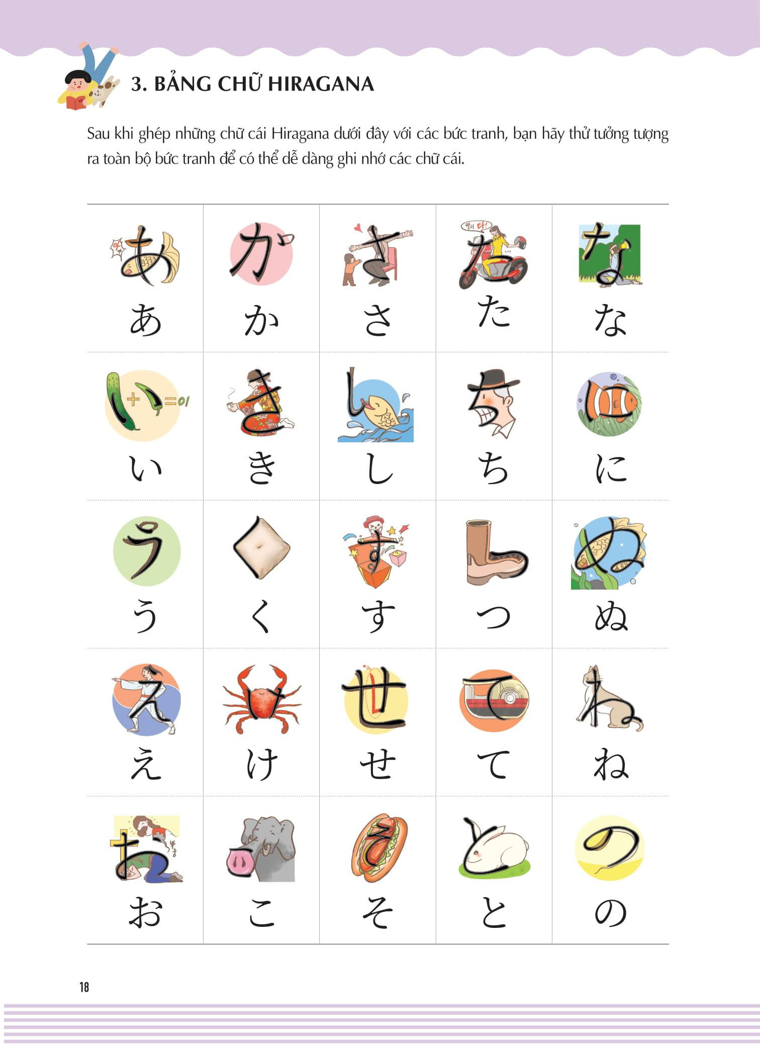 - Nhiều tranh minh họa phù hợp nhất với từng chữ viết để người học có thể phân biệt và ghi nhớ được các chữ cái Hiragana và Katakana