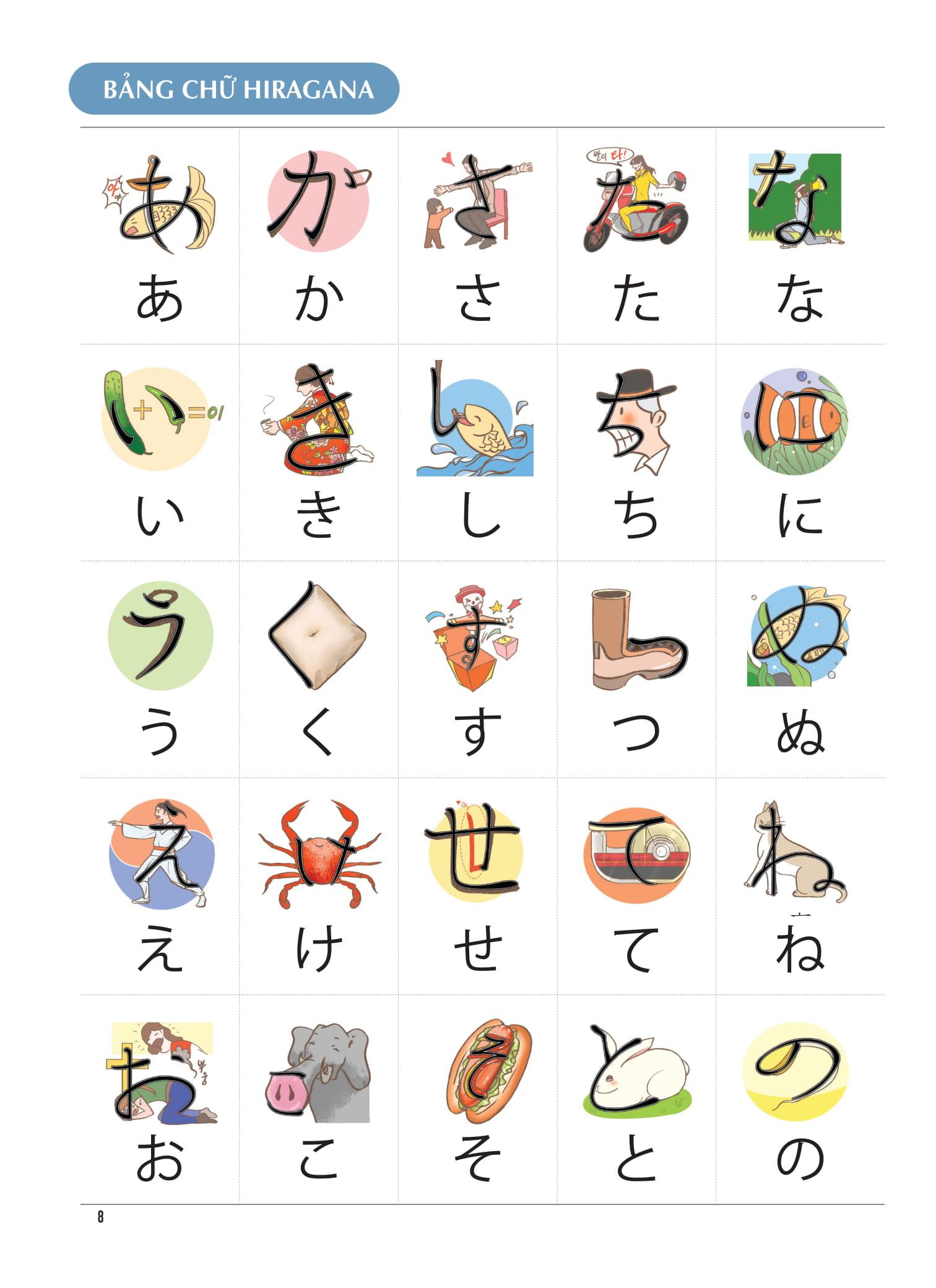 50 bức ảnh minh họa bảng chữ cái Hiragana, bao gồm các hình ảnh minh họa phù hợp nhất với các chữ cái để người học liên tưởng đến các hình ảnh và học thuộc dễ dàng