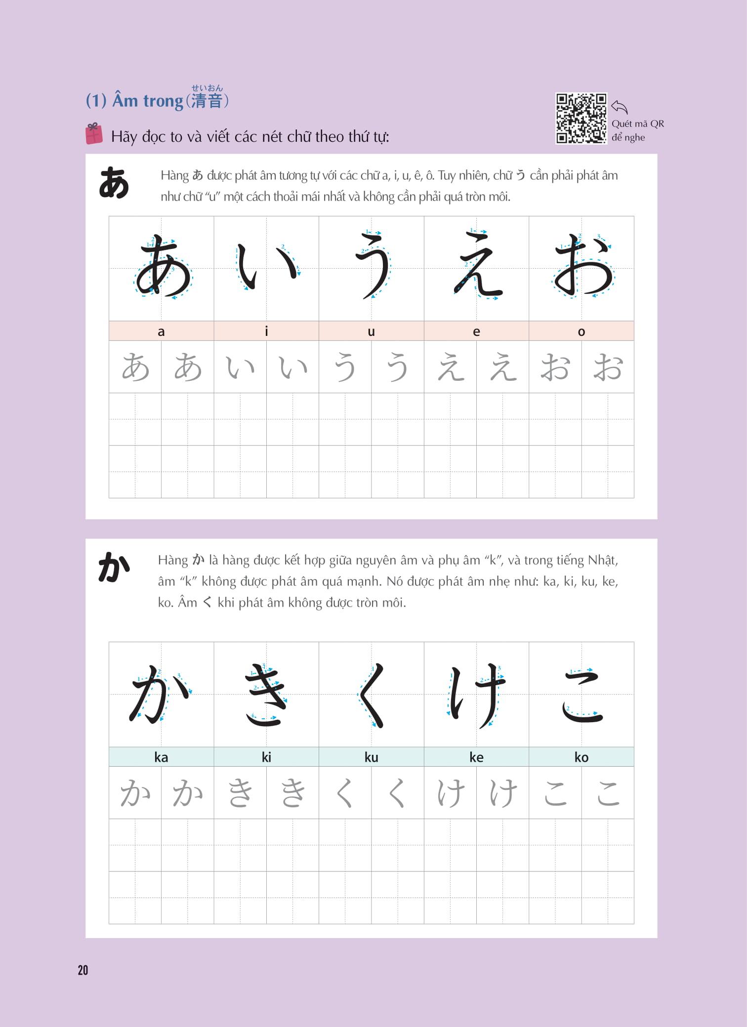 Cuốn sách giải thích chi tiết hai bảng chữ cái Hiragana và Katakana theo từng dòng để người học có thể dễ dàng viết theo, ghi nhớ và viết được chính xác chữ cái đó.