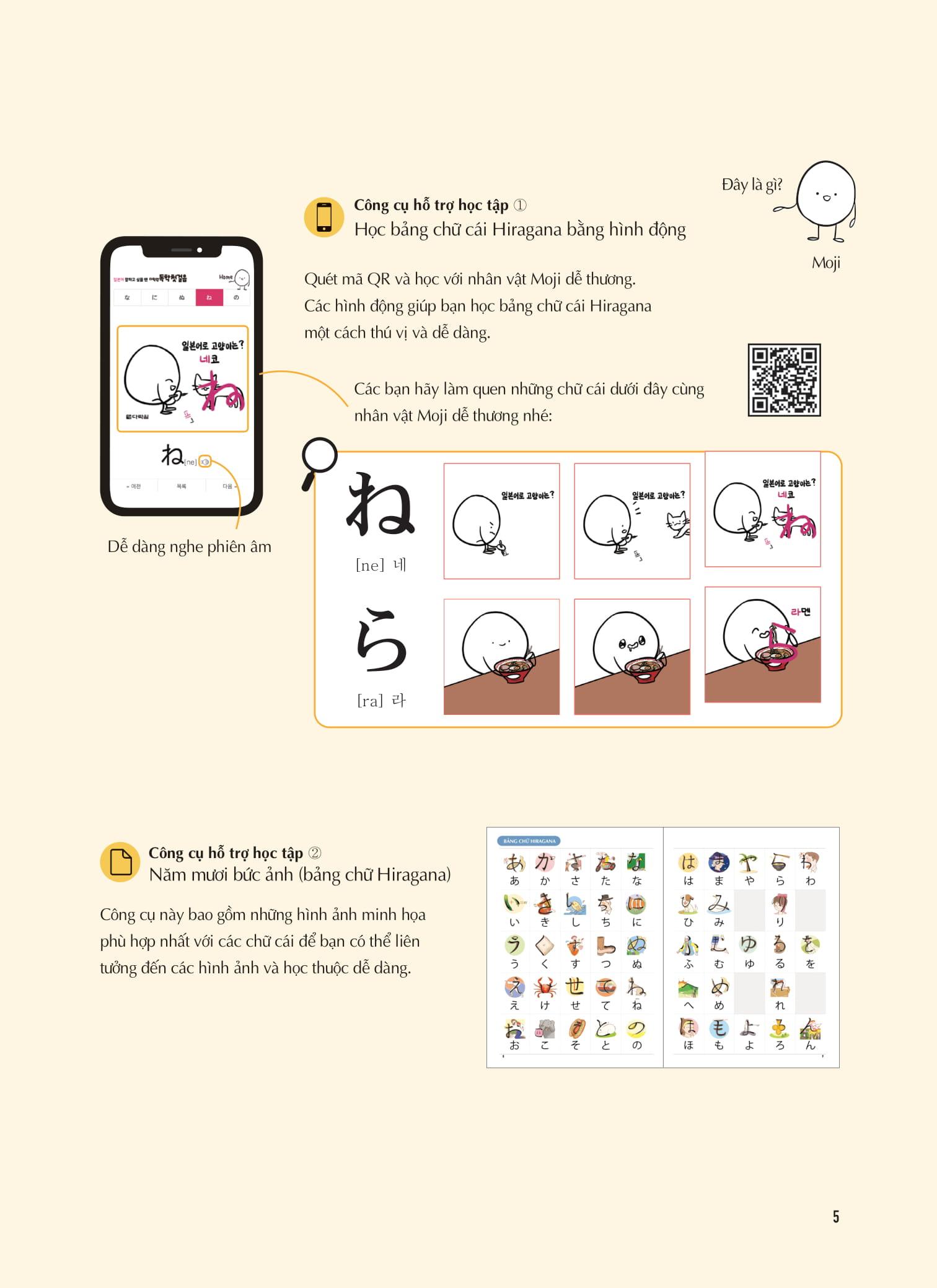 Quét mã QR học bảng chữ cái Hiragana bằng hình động emoji dễ thương, trực quan dễ hình dung