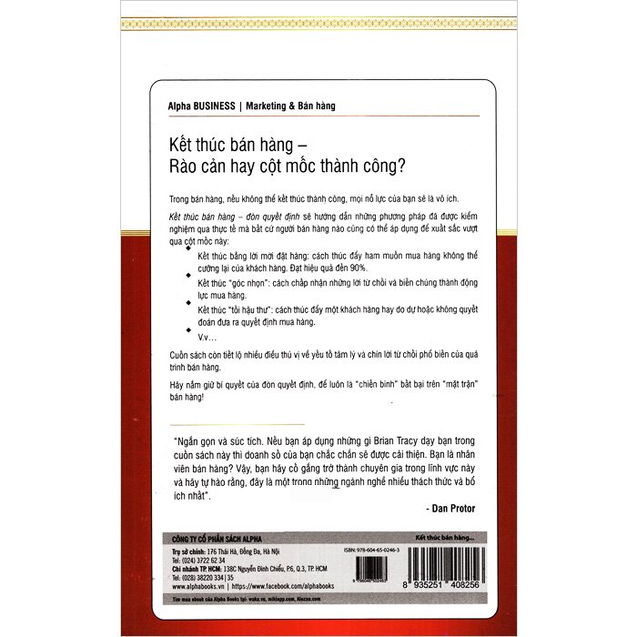 - … Cuốn sách còn tiết lộ nhiều điều thú vị về yếu tố tâm lý và chín lời từ chối phổ biến của quá trình bán hàng. Hãy nắm giữ bí quyết của đòn quyết định, để luôn là “chiến binh” bất bại trên “mặt trận” bán hàng!