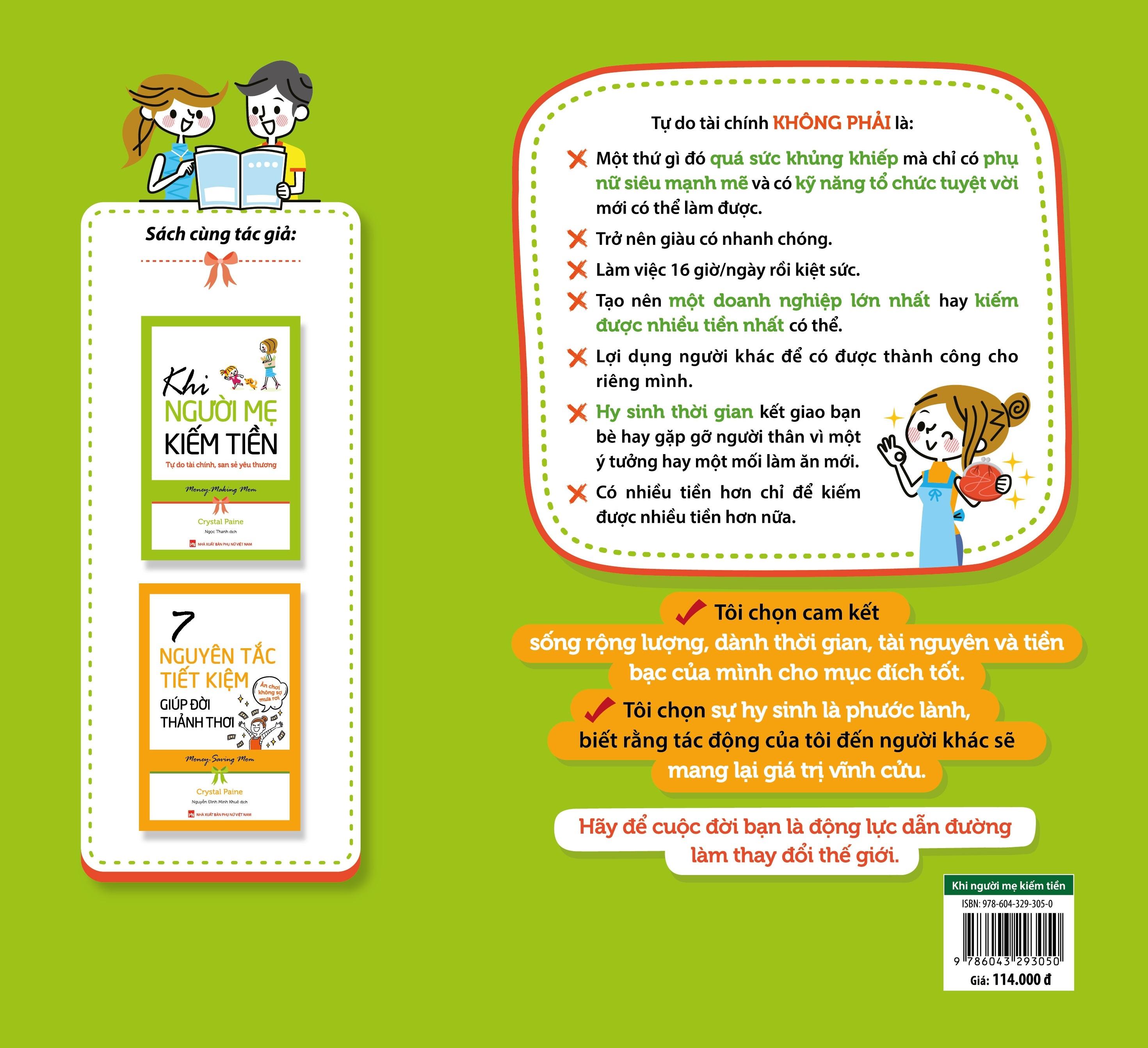 Là một người nội trợ, tác giả Crystal Paine thấu hiểu được niềm hạnh phúc của những người phụ nữ mong muốn ở nhà để được chăm sóc, gần gũi con nhỏ, nhưng đồng thời cũng muốn kiếm thêm nguồn thu nhập đỡ đần gia đình. Vì thế, “Khi người mẹ kiếm tiền: Tự do tài chính, san sẻ yêu thương” ra đời. Cuốn sách khuyến khích người đọc đào sâu hết mức có thể để khám phá tài năng, kỹ năng, đam mê và kiến thức của bản thân, từ đó kết hợp tất cả lại thành một công việc/dự án kinh doanh riêng để kiếm tiền. Đồng thời, cuốn sách còn hướng dẫn chi tiết từ cách phát triển bản thân, xây dựng thương hiệu, mục tiêu của doanh nghiệp, thuê nhân viên cho đến quản lý thời gian và vượt qua những chướng ngại sẽ gặp phải trên hành trình tiến tới tự do tài chính – vấn đề cốt lõi của cuốn sách.