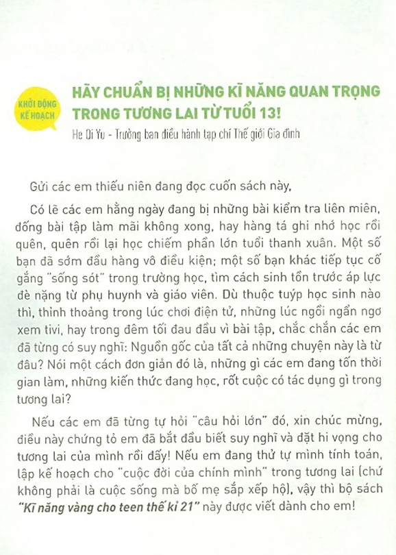 "Kĩ Năng Vàng Cho Teen Thế Kỉ 21" là bộ sách thiết thực dành cho các bạn trẻ từ 11 đến 15 tuổi, giúp các bạn trang bị những kỹ năng sống cần thiết để thành công trong học tập và cuộc sống. Bộ sách cung cấp những giải pháp hiệu quả cho những vấn đề mà các bạn teen thường gặp phải, từ việc quản lý cảm xúc đến việc xây dựng các mối quan hệ.